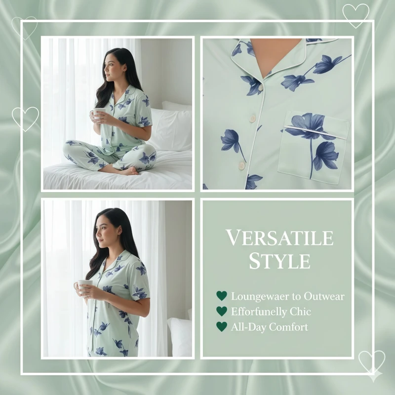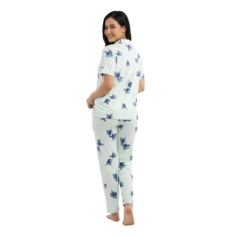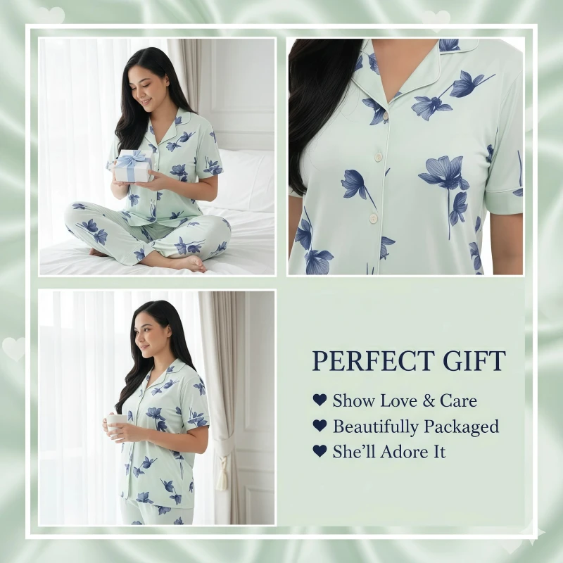 **Product Description:** Drift into peaceful slumber and wake up refreshed with our **"Mint Blossom" Floral Button-Up Pajama Set**. This classic yet charming two-piece sleepwear ensemble combines timeless style with modern comfort. The short-sleeve top features a sophisticated notch collar and a full button-front closure, all adorned with a delightful blue floral print against a refreshing mint green background. Crafted from a wonderfully soft and breathable fabric, this set feels exceptionally gentle against your skin, ensuring ultimate comfort for a restful night or leisurely lounging. The coordinating full-length pants complete the look with a comfortable, relaxed fit and an elasticized waistband, allowing for complete freedom of movement. Experience the perfect blend of elegance and ease with this beautiful and versatile pajama set. --- **Key Features (Can also be used as bullet points in description):** * Luxuriously soft and breathable fabric for supreme comfort * Classic short-sleeve button-up top with notch collar * Charming blue floral print on a refreshing mint green background * Coordinating full-length pants with a comfortable, relaxed fit * Elasticized waistband for a secure yet gentle feel * Ideal for sleeping, lounging, and stylish home wear * Easy to care for and durable --- **Keywords for SEO:** **General:** * Ladies pajama set * Women's sleepwear * Button-up pajamas * Two-piece pajama set * Comfort pajamas * Soft loungewear * Classic sleepwear * Relaxed fit pajamas * Home clothes * Night suit women **Specific:** * pajama set * Floral print pajamas * floral sleepwear * Notch collar pajamas * Short sleeve button front * Long pants pajamas * Spring pajamas * Summer pajamas * Breathable sleepwear * Elegant pajamas * Printed loungewear **Design/Style:** * Classic floral print * Traditional pajama style * Charming sleepwear * Relaxed elegance