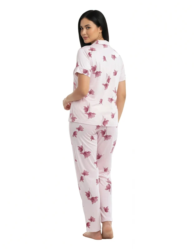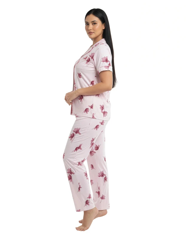Drift into peaceful slumber and wake up refreshed with our **"Mint Blossom" Floral Button-Up Pajama Set**. This classic yet charming two-piece sleepwear ensemble combines timeless style with modern comfort. The short-sleeve top features a sophisticated notch collar and a full button-front closure, all adorned with a delightful blue floral print against a refreshing mint green background. Crafted from a wonderfully soft and breathable fabric, this set feels exceptionally gentle against your skin, ensuring ultimate comfort for a restful night or leisurely lounging. The coordinating full-length pants complete the look with a comfortable, relaxed fit and an elasticized waistband, allowing for complete freedom of movement. Experience the perfect blend of elegance and ease with this beautiful and versatile pajama set.