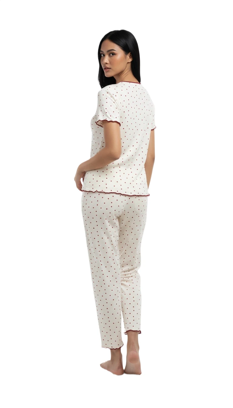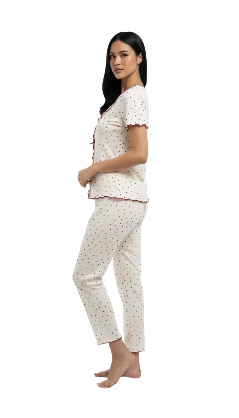 Indulge in cozy comfort and classic style with our charming Black Polka Dot Pajama Set. This elegant two-piece sleepwear features a soft, cream-colored top adorned with an adorable black polka dot pattern. The top boasts a stylish ruffled collar with black trim, a flattering V-neckline, and cute short sleeves, enhanced by decorative black bows down the front. The matching full-length pants echo the polka dot design and have a comfortable elastic waistband for a perfect fit, along with ruffled black trim at the ankles. Crafted from a gentle, breathable fabric, this pajama set offers ultimate comfort for a restful night's sleep or relaxed lounging at home. Its timeless design makes it a delightful addition to any sleepwear collection.
