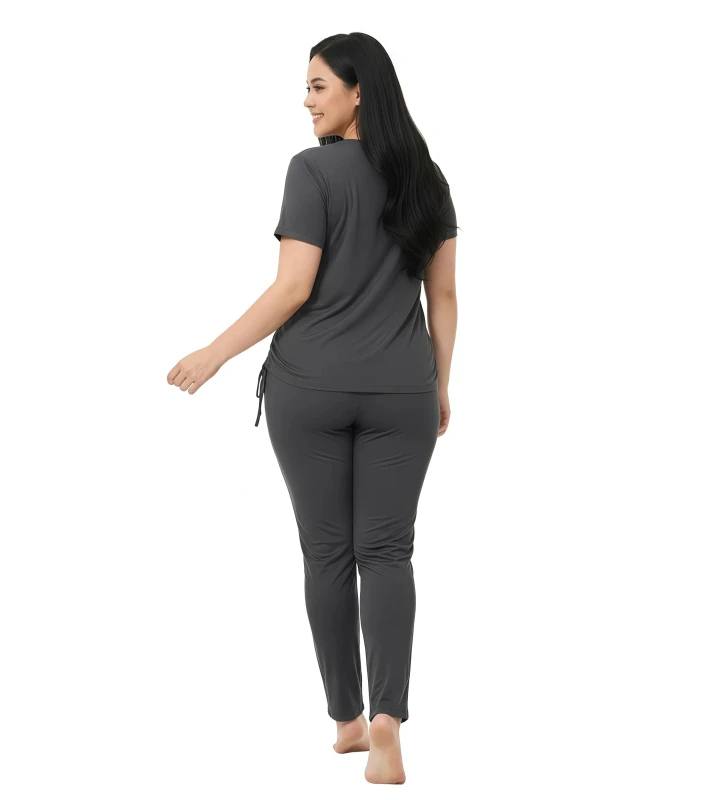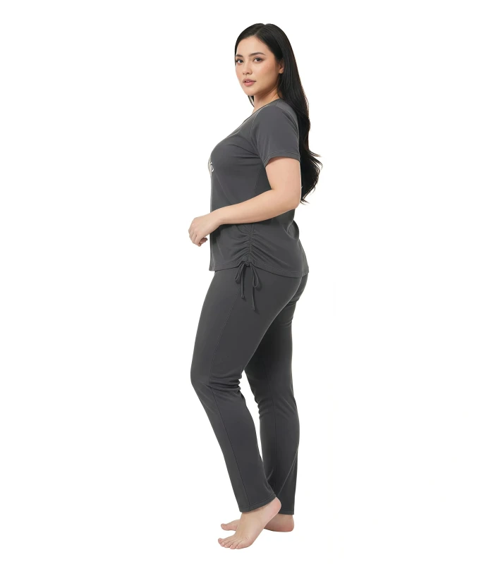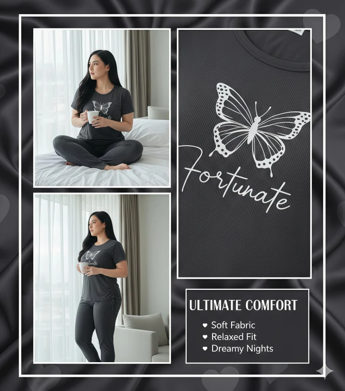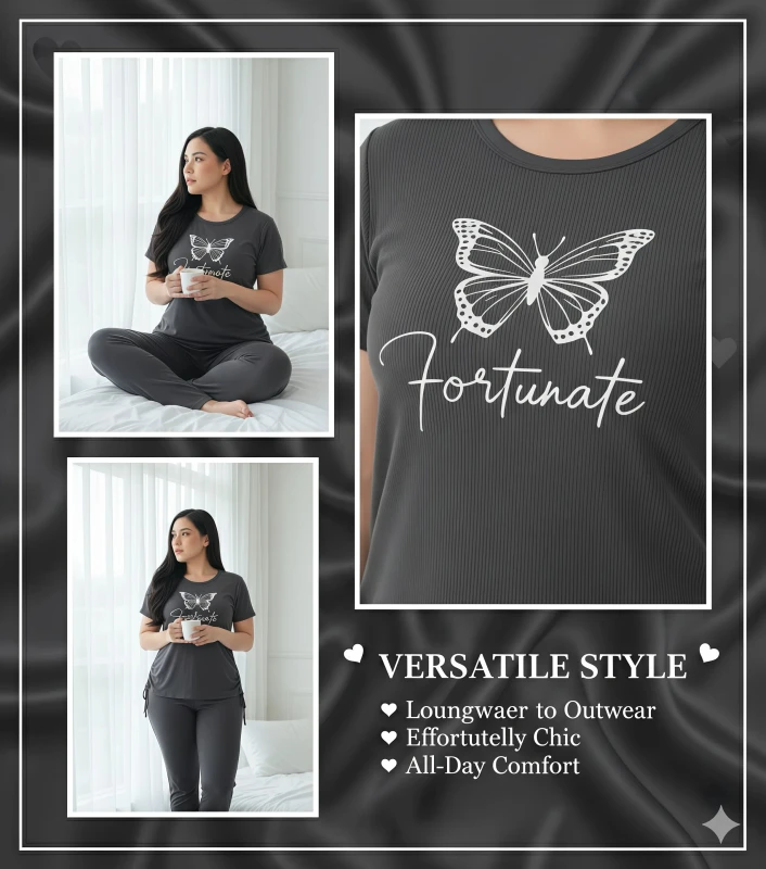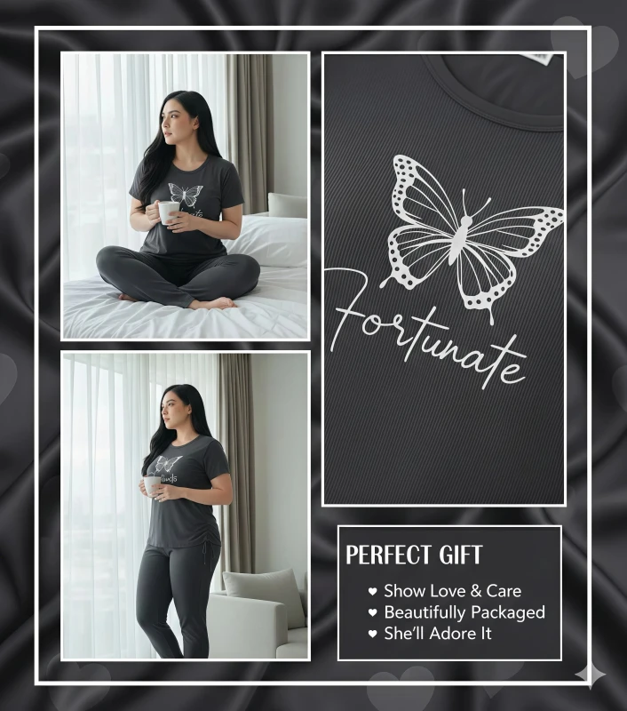 **Product Description:** This chic two-piece pajama set for women is designed for those who appreciate thoughtful details and ultimate relaxation. The short-sleeve top, in a sophisticated charcoal grey, features an inspiring white butterfly graphic alongside the elegant script "Fortunate," adding a touch of personal charm. What makes this set truly unique is the adjustable side-tie detail on the top, allowing you to customize the fit and style to your preference. Crafted from a wonderfully soft and breathable fabric, it promises gentle comfort against your skin, perfect for unwinding after a busy day or enjoying a leisurely morning. The coordinating full-length pants offer a comfortable, relaxed fit with a smooth waistband, ensuring complete freedom of movement. Embrace comfort and fortune with this versatile and stylish sleepwear ensemble. --- Key Features * Supremely soft and breathable fabric for continuous comfort * Chic charcoal grey short-sleeve top with "Fortunate" butterfly graphic * Unique adjustable side-tie detail on the top for custom styling * Coordinating full-length pants with a comfortable, relaxed fit * Gentle elastic waistband for a non-restrictive feel * Ideal for sleeping, lounging, and stylish home wear * Durable and easy to care for Keywords **General:** * Ladies pajama set * Women's sleepwear * Two-piece lounge set * Pants and top pajamas * Comfortable pajamas * Soft loungewear * Relaxed fit sleepwear * Casual home wear * Women's night suit **Specific:** * pajama set * Butterfly print pajamas * "Fortunate" sleepwear * Adjustable side-tie top * Short sleeve pajama * Long pants pajamas * Graphic print loungewear * Breathable sleepwear * Stylish women's pajamas * Customizable fit pajamas **Design/Style:** * Modern loungewear * Chic sleepwear * Unique detail pajamas * Fashionable home clothes