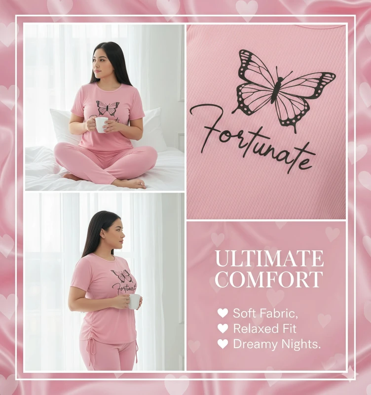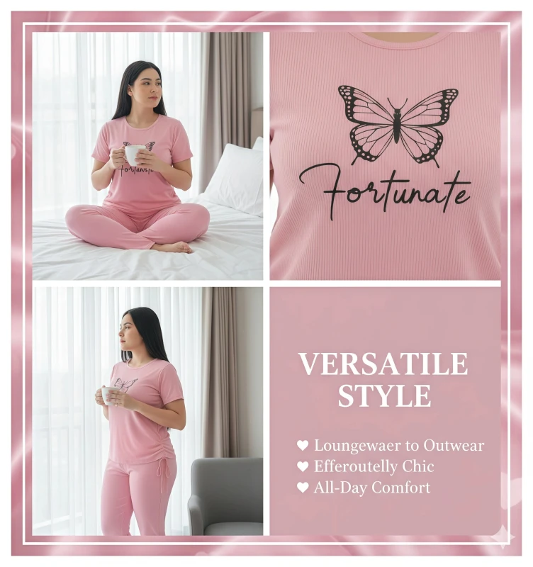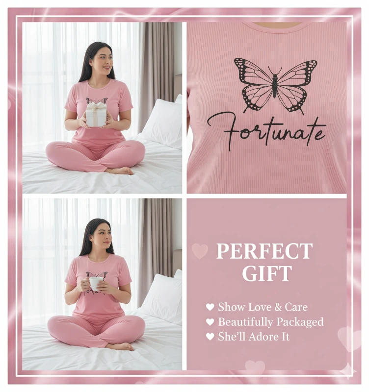 This chic two-piece pajama set for women is designed for those who appreciate thoughtful details and ultimate relaxation. The short-sleeve top, in a sophisticated charcoal grey, features an inspiring white butterfly graphic alongside the elegant script "Fortunate," adding a touch of personal charm. What makes this set truly unique is the adjustable side-tie detail on the top, allowing you to customize the fit and style to your preference. Crafted from a wonderfully soft and breathable fabric, it promises gentle comfort against your skin, perfect for unwinding after a busy day or enjoying a leisurely morning. The coordinating full-length pants offer a comfortable, relaxed fit with a smooth waistband, ensuring complete freedom of movement. Embrace comfort and fortune with this versatile and stylish sleepwear ensemble.