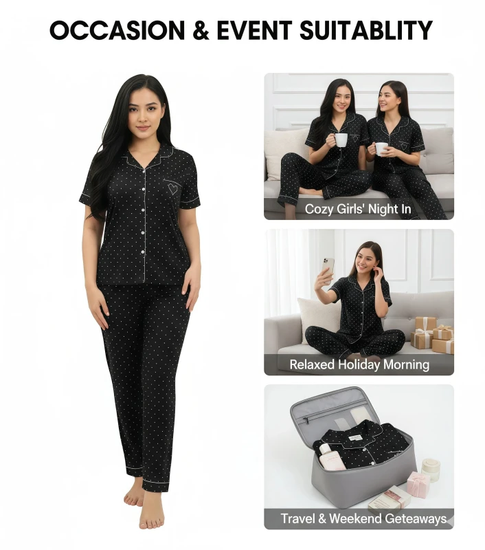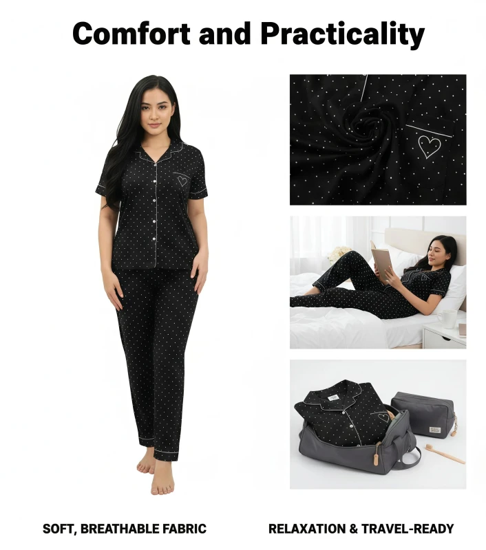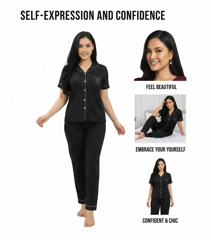 **Product Description:** This charming two-piece sleepwear ensemble blends timeless elegance with a touch of affectionate detail, making it perfect for cozy nights and relaxed mornings. The short-sleeve top features a sophisticated notch collar and a full button-front closure, all beautifully outlined with crisp white piping. Adorned with a delightful white polka dot print on a classic black background, the top also boasts a sweet embroidered heart detail on the chest, adding a subtle personal touch. Crafted from an incredibly soft and breathable fabric, this set provides exceptional comfort against your skin, ideal for year-round wear. The coordinating full-length pants complete the look with a comfortable, relaxed fit and an elasticized waistband, ensuring unrestricted movement. Embrace delightful comfort and endearing style with this lovely and versatile pajama set. --- Key Features * Luxuriously soft and breathable fabric for supreme comfort * Classic short-sleeve button-up top with notch collar * Chic black base with white polka dot print * Elegant white contrast piping detail * Sweet embroidered heart graphic on the chest * Coordinating full-length pants with a comfortable, relaxed fit * Elasticized waistband for a secure yet gentle feel * Ideal for sleeping, lounging, and stylish home wear * Durable and easy to care for Keywords **General:** * Ladies pajama set * Women's sleepwear * Button-up pajamas * Two-piece pajama set * Comfort pajamas * Soft loungewear * Classic sleepwear * Relaxed fit pajamas * Home clothes * Night suit women **Specific:** * pajama set * Polka dot pajamas * Heart print sleepwear * Piped pajamas * Notch collar pajamas * Short sleeve button front * Long pants pajamas * Romantic pajamas * Breathable sleepwear * Elegant pajamas * Printed loungewear * Cute pajamas **Design/Style:** * Classic polka dot * Sweet design * Timeless elegance * Charming comfort * Heart detail sleepwear