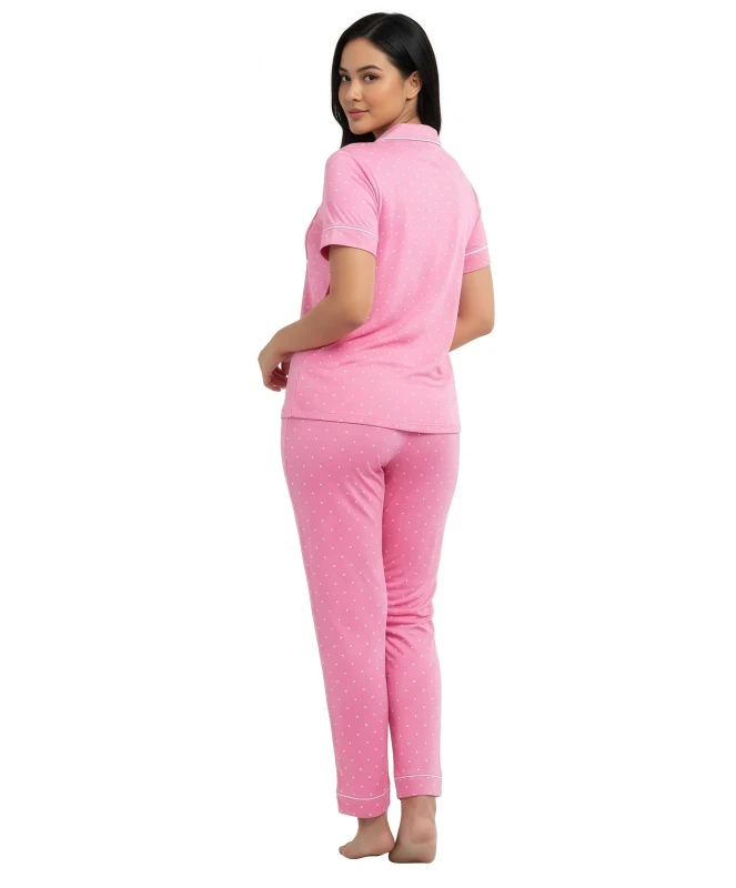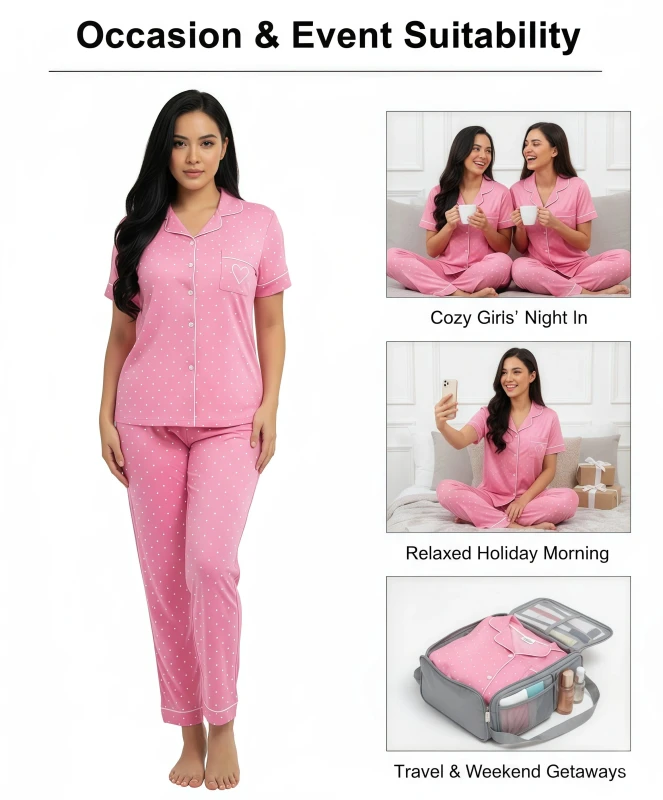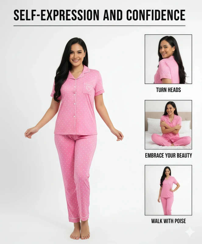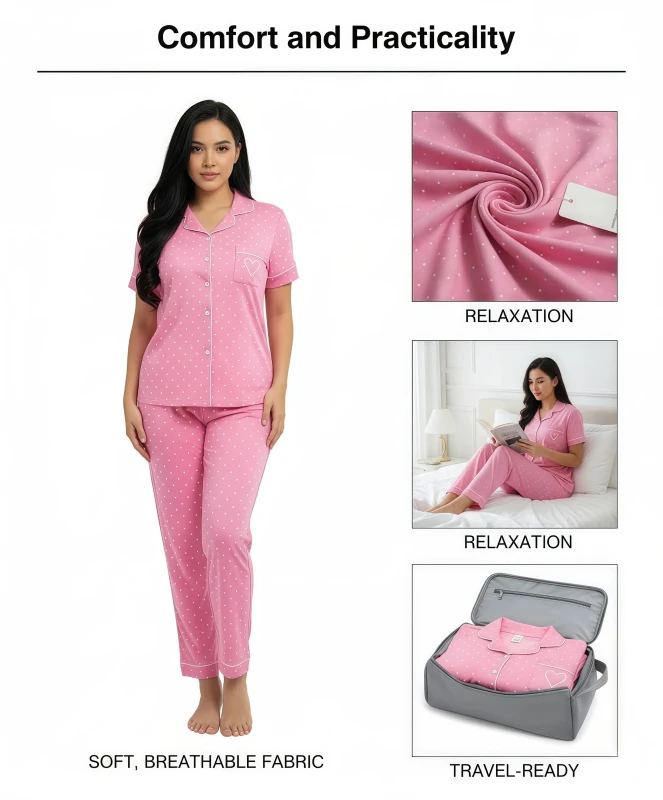 **Product Description:** This charming two-piece sleepwear ensemble blends timeless elegance with a touch of affectionate detail, making it perfect for cozy nights and relaxed mornings. The short-sleeve top features a sophisticated notch collar and a full button-front closure, all beautifully outlined with crisp white piping. Adorned with a delightful white polka dot print on a classic black background, the top also boasts a sweet embroidered heart detail on the chest, adding a subtle personal touch. Crafted from an incredibly soft and breathable fabric, this set provides exceptional comfort against your skin, ideal for year-round wear. The coordinating full-length pants complete the look with a comfortable, relaxed fit and an elasticized waistband, ensuring unrestricted movement. Embrace delightful comfort and endearing style with this lovely and versatile pajama set. --- Key Features * Luxuriously soft and breathable fabric for supreme comfort * Classic short-sleeve button-up top with notch collar * Chic black base with white polka dot print * Elegant white contrast piping detail * Sweet embroidered heart graphic on the chest * Coordinating full-length pants with a comfortable, relaxed fit * Elasticized waistband for a secure yet gentle feel * Ideal for sleeping, lounging, and stylish home wear * Durable and easy to care for Keywords **General:** * Ladies pajama set * Women's sleepwear * Button-up pajamas * Two-piece pajama set * Comfort pajamas * Soft loungewear * Classic sleepwear * Relaxed fit pajamas * Home clothes * Night suit women **Specific:** * pajama set * Polka dot pajamas * Heart print sleepwear * Piped pajamas * Notch collar pajamas * Short sleeve button front * Long pants pajamas * Romantic pajamas * Breathable sleepwear * Elegant pajamas * Printed loungewear * Cute pajamas **Design/Style:** * Classic polka dot * Sweet design * Timeless elegance * Charming comfort * Heart detail sleepwear