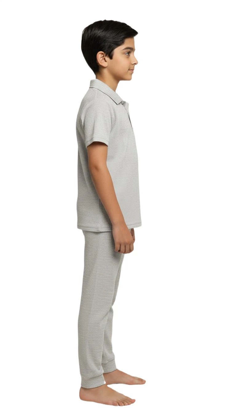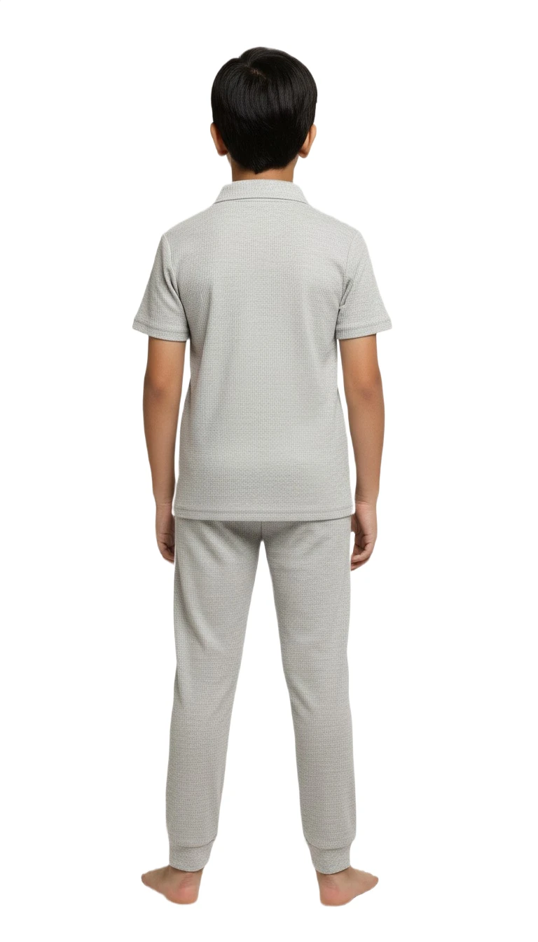 Ensure your little one enjoys ultimate comfort and style with our Boys' Ribbed Knit Gray Polo Pajama Set. This soft and cozy two-piece sleepwear features a classic polo-style top with a ribbed texture, a smart collar, and a convenient three-button placket for easy wear. The short sleeves provide breathability, making it suitable for year-round comfort. The matching full-length pants come with a comfortable elastic waistband and echo the ribbed knit design, ensuring a relaxed fit for sleeping or lounging. Crafted from a gentle, breathable fabric in a versatile light gray hue, this pajama set is perfect for a peaceful night's sleep or comfortable playtime at home.