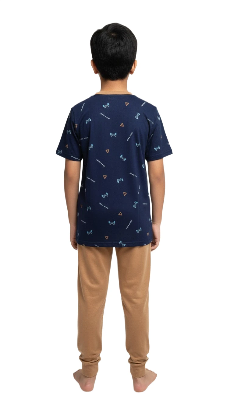 gamer PJs, player badge, navy blue, khaki pants, printed pajamas, fun pajamas,