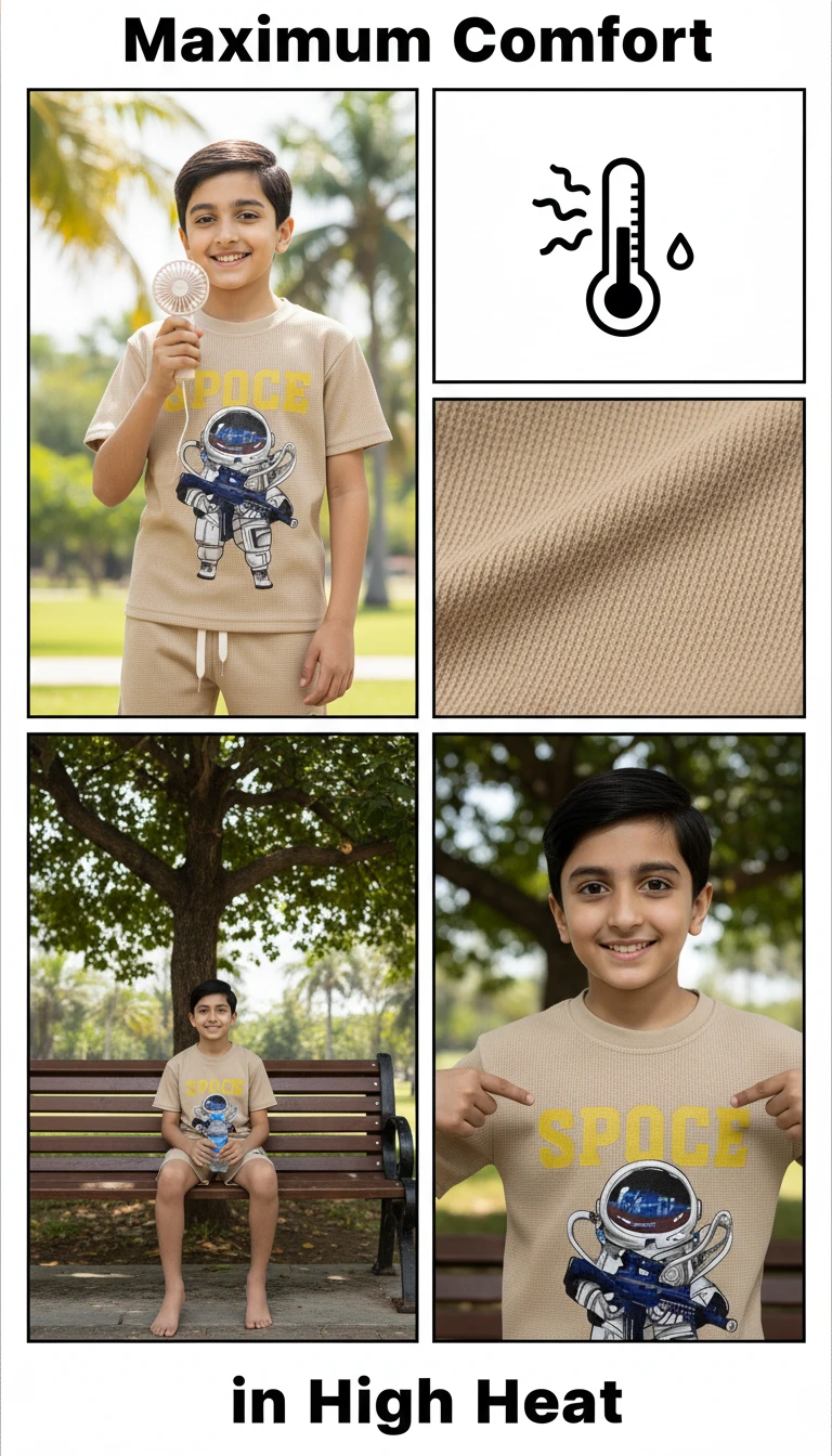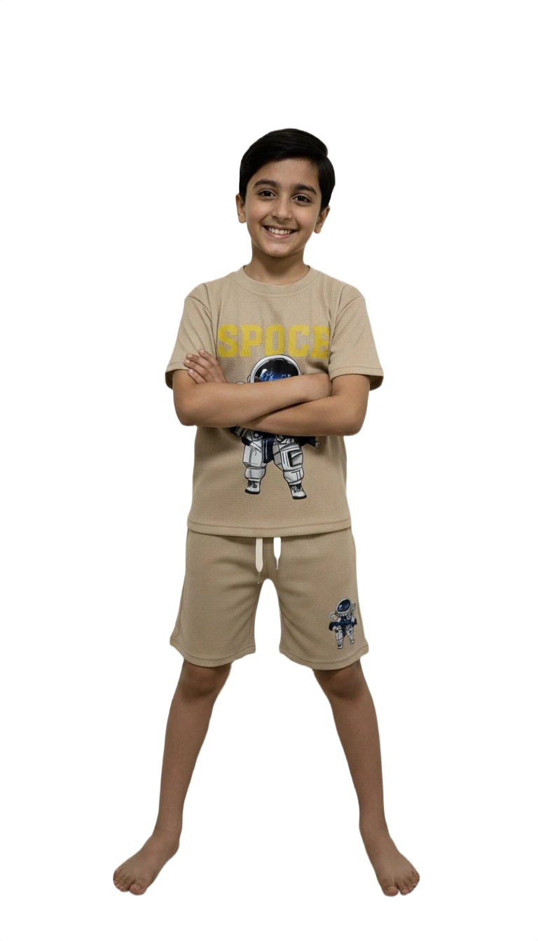 Blast off into comfort and style with our Boys' Space Explorer Casual Set! This two-piece outfit is perfect for your little adventurer, featuring a soft, breathable waffle-knit fabric that's ideal for everyday wear, playdates, or just lounging around. The top showcases a cool astronaut graphic holding a ray gun, with "SPACE" boldly written above, inspiring dreams of intergalactic travel. The matching shorts complete the look with subtle astronaut details, an elastic waistband, and an adjustable drawstring for a perfect fit. Designed for comfort and durability, this set will quickly become a favorite in his wardrobe.