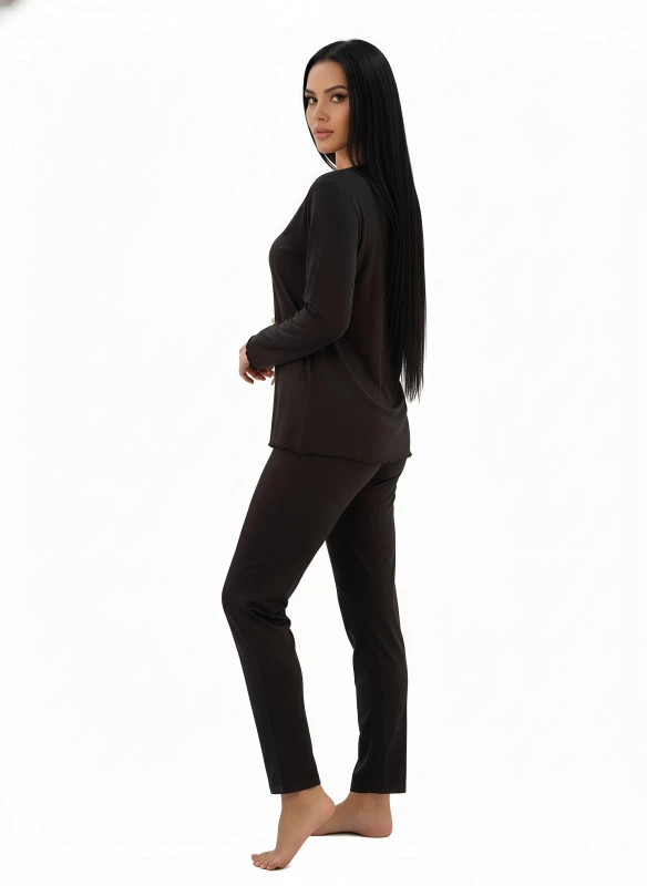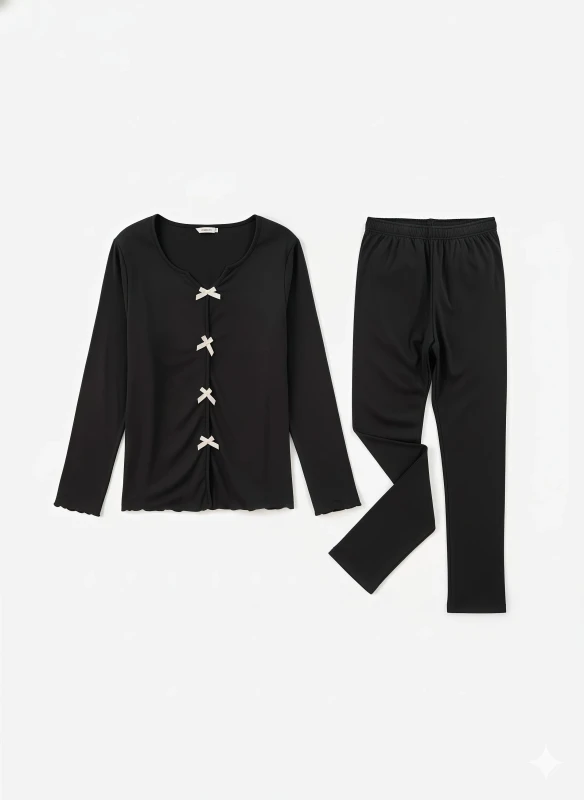 Discover ultimate comfort and sweet style with this charming women's loungewear or pajama set. This cozy two-piece ensemble features a long-sleeved top with a flattering scoop neckline, adorned with decorative, delicate bows down the front for a touch of feminine charm. The matching full-length pants complete the set, designed for relaxed wear. Crafted from a soft, stretchable fabric in a rich teal or deep blue hue, this set promises comfortable nights and relaxed days, making it an essential addition to your comfort wardrobe.