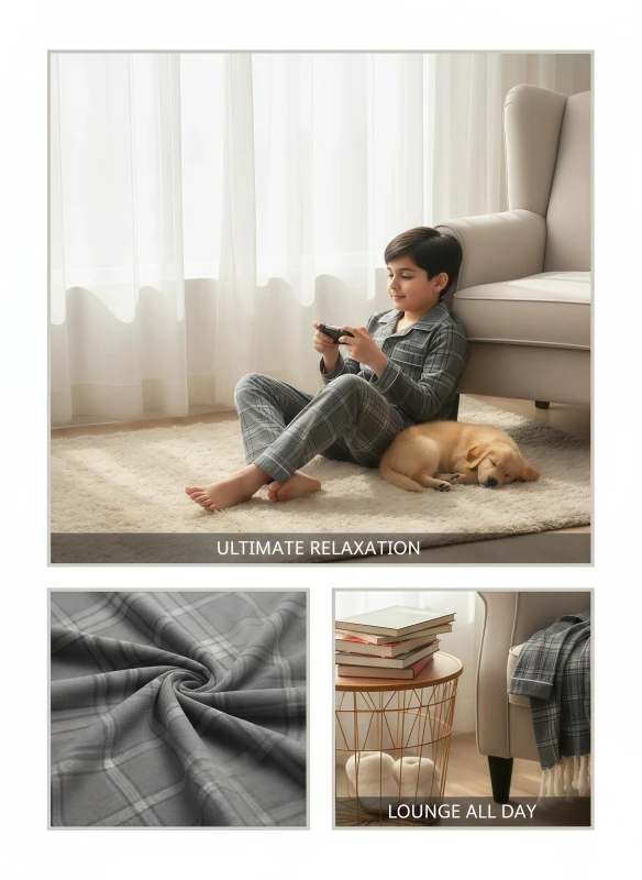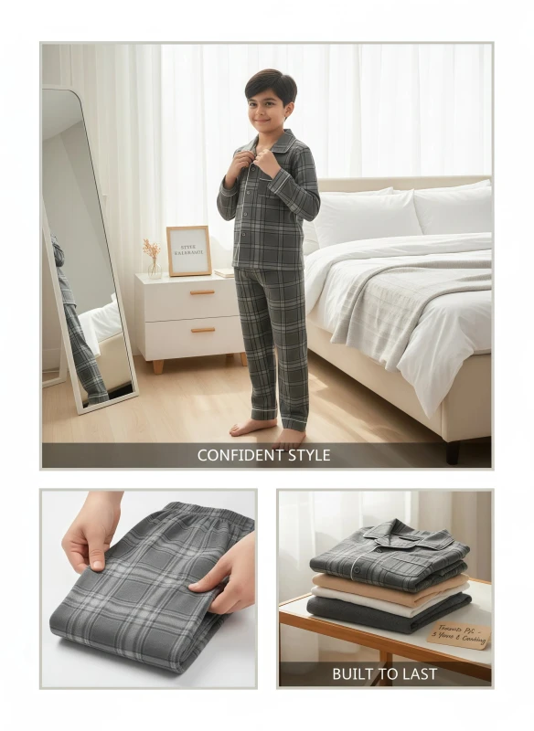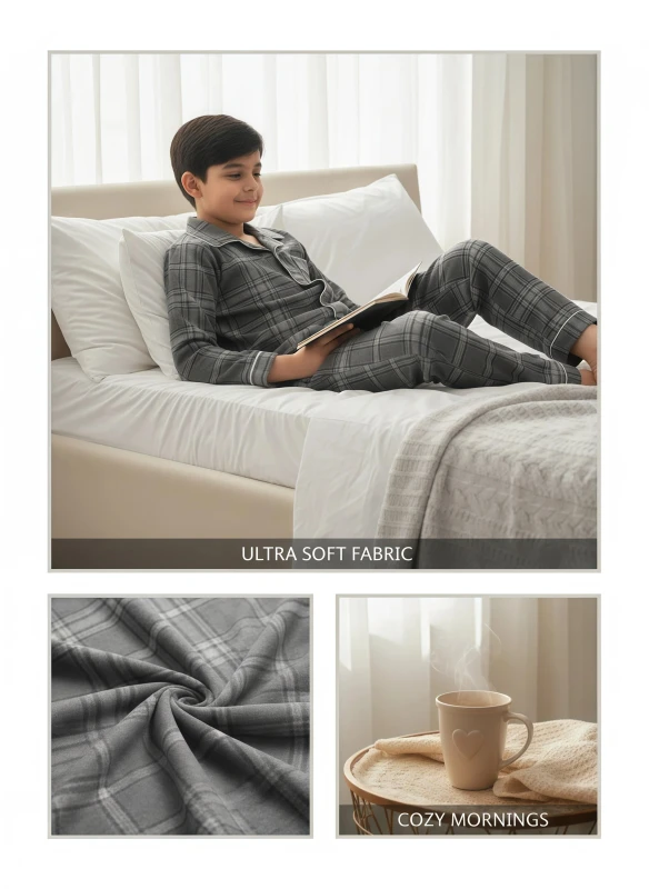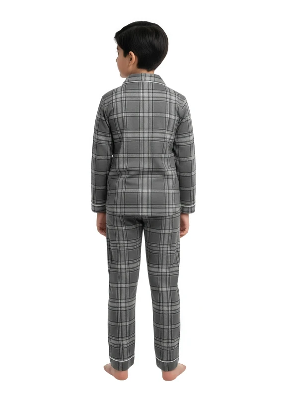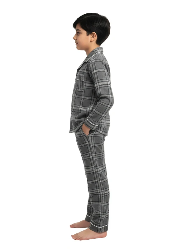 This classic boy's grey plaid pajama set is designed for ultimate comfort and timeless style, perfect for winding down after a long day. The set features a soft, long-sleeved button-up top with a sophisticated grey and white plaid pattern, accented with crisp white piping along the collar, front placket, cuffs, and a single chest pocket. The matching full-length pajama pants complete the look, ensuring head-to-toe coziness.