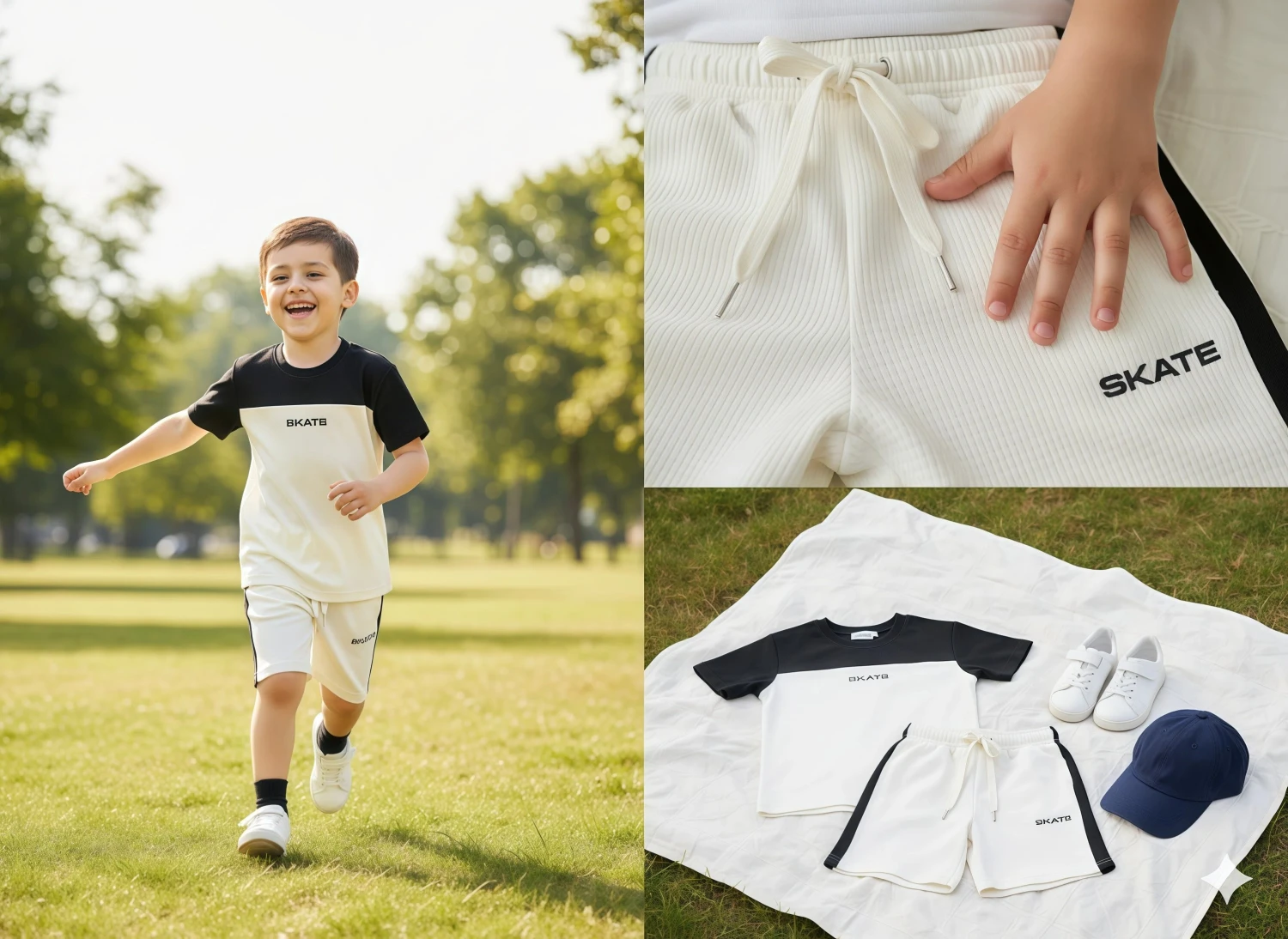 • Matching shorts with side stripes and "SKATE" detail.