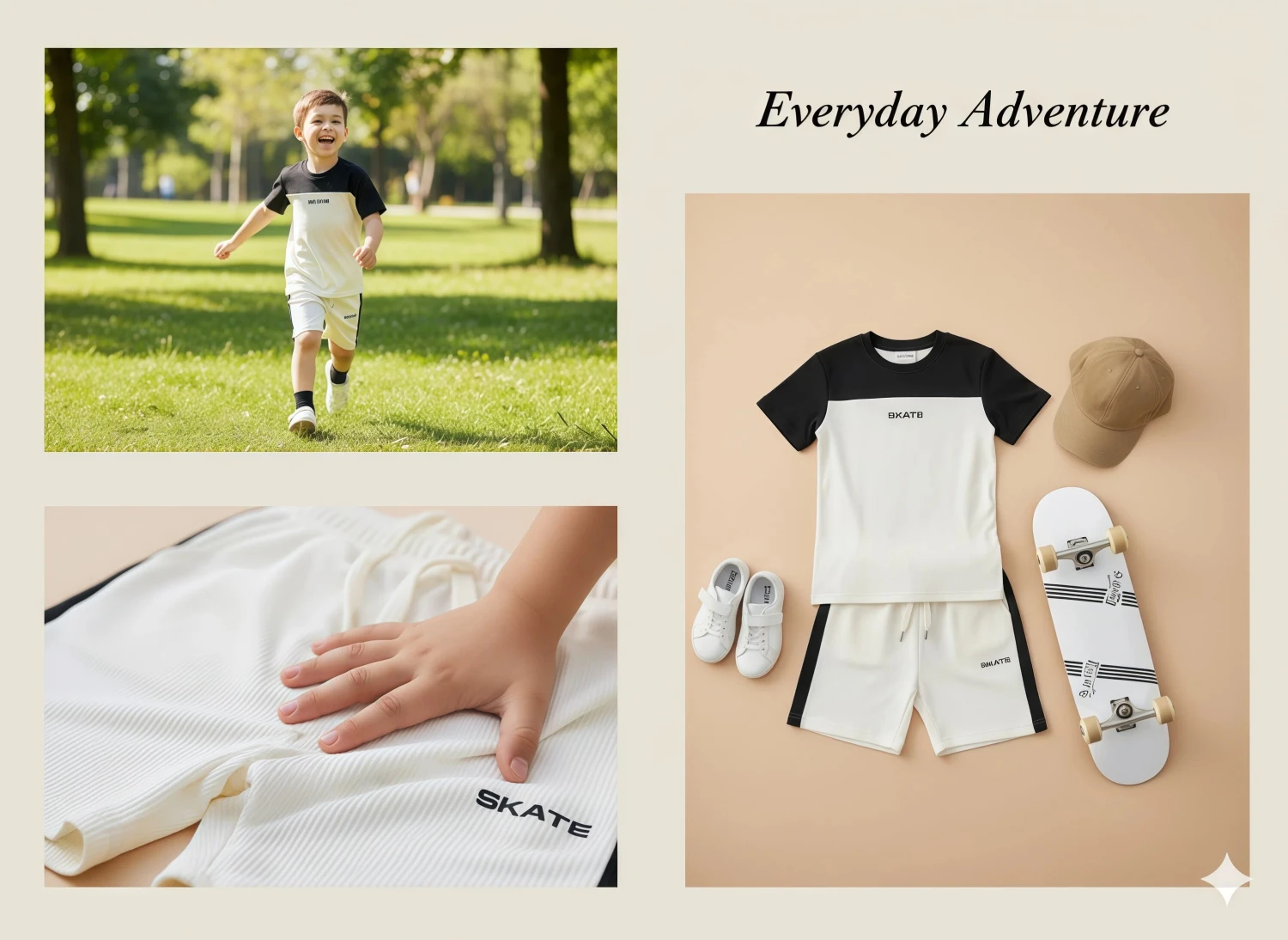 The set features a dynamic color block t-shirt with a bold "SKATE" graphic emblazoned across the chest, combining a classic black top panel with a crisp cream body. Paired with matching cream shorts that also sport the "SKATE" detail and cool black side stripes, this outfit is designed for both style and movement. Crafted from soft, breathable fabric, it ensures comfort throughout the day, while the elastic drawstring waist on the shorts provides a flexible, secure fit. This set is an effortless way to keep your boy looking sharp and feeling great!