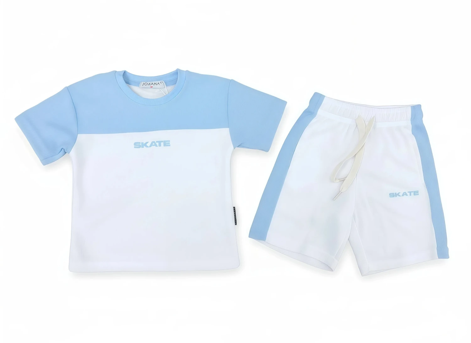 set features a dynamic color block t-shirt with a bold "SKATE"