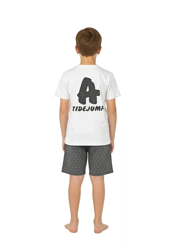 Gear up for endless fun with our "Urban Tide" Casual Set, perfect for the active and stylish young boy. This vibrant two-piece outfit features a crisp white short-sleeve t-shirt adorned with a bold "TIDEJUMP" graphic and distinctive "A" logo, adding a cool, adventurous flair. The tee is paired with comfortable black shorts that showcase a dynamic all-over geometric pattern and a contrasting white drawstring for an adjustable, secure fit. Crafted for comfort and effortless style, this set is ideal for everything from skateboarding at the park to chilling with friends or summer adventures.