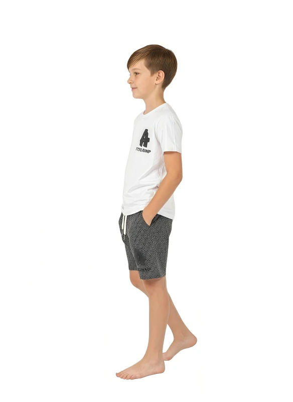 General: boy, boys, kids, children, youth, casual, set, outfit, two-piece, summer, spring, comfortable, stylish, white, black, patterned, graphic, print, everyday, wear, fashion, clothing, apparel