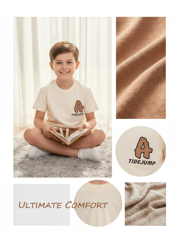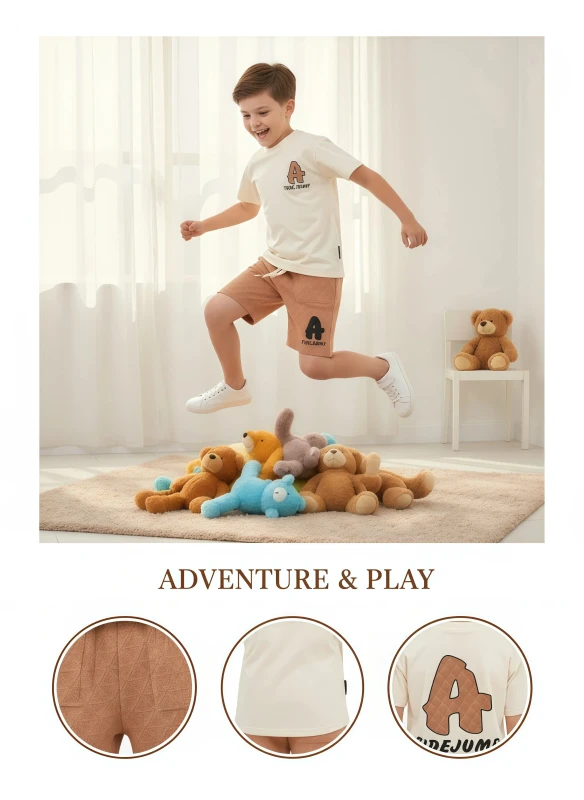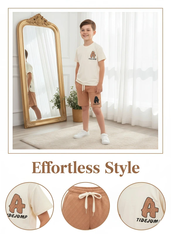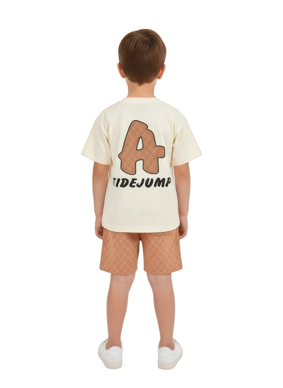 Gear up for endless fun with our "Urban Tide" Casual Set, perfect for the active and stylish young boy. This vibrant two-piece outfit features a crisp white short-sleeve t-shirt adorned with a bold "TIDEJUMP" graphic and distinctive "A" logo, adding a cool, adventurous flair. The tee is paired with comfortable black shorts that showcase a dynamic all-over geometric pattern and a contrasting white drawstring for an adjustable, secure fit. Crafted for comfort and effortless style, this set is ideal for everything from skateboarding at the park to chilling with friends or summer adventures.