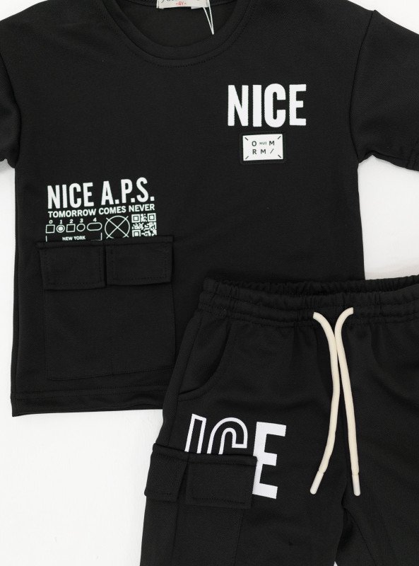 Add bold style to your boy's everyday wardrobe with this trendy two-piece set. Featuring a soft, breathable t-shirt paired with comfy drawstring shorts, this set is perfect for active days or casual outings. The modern street-style graphics, utility-inspired pockets, and bold lettering like "NICE A.P.S." and "TOMORROW COMES NEVER" bring a cool, urban edge.
