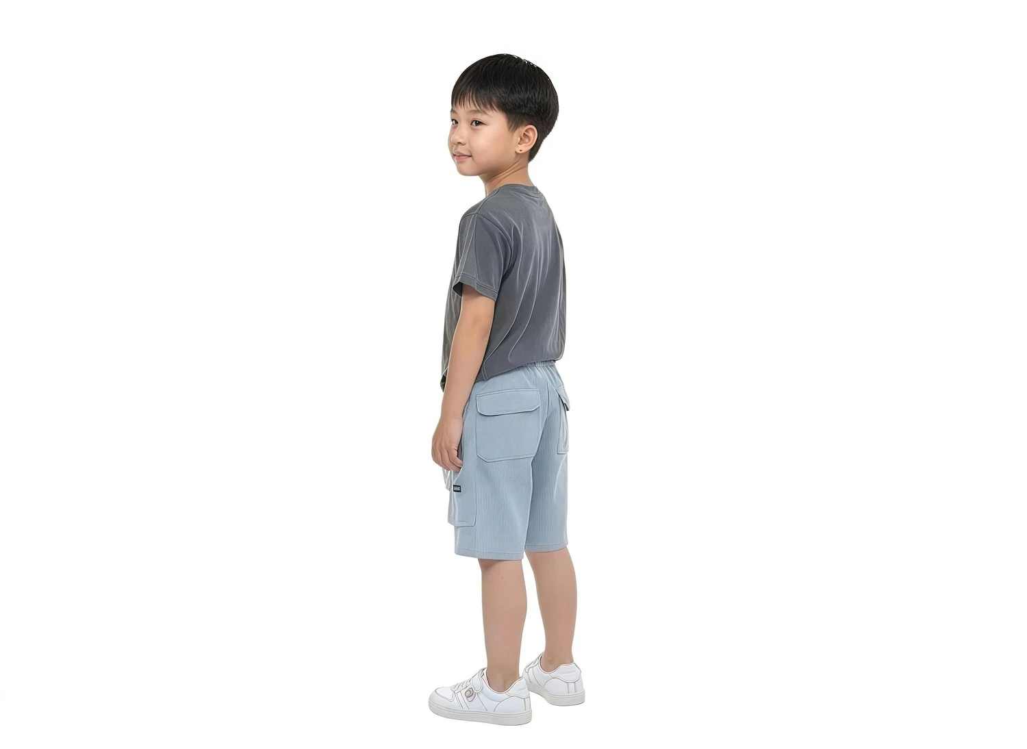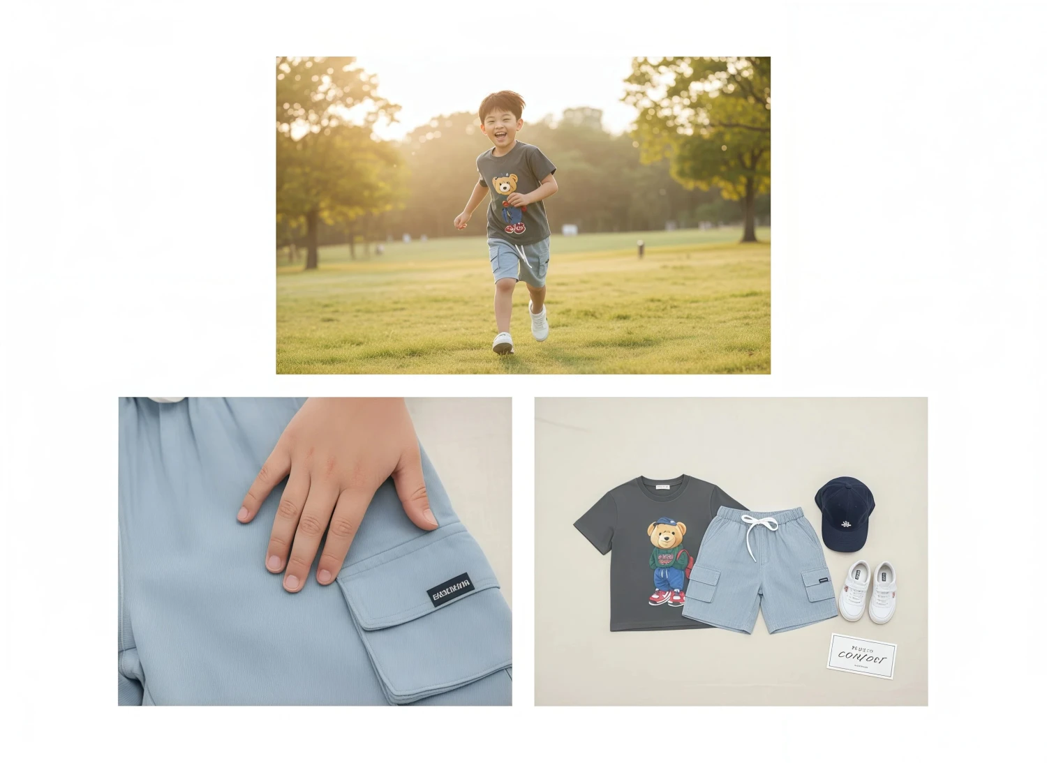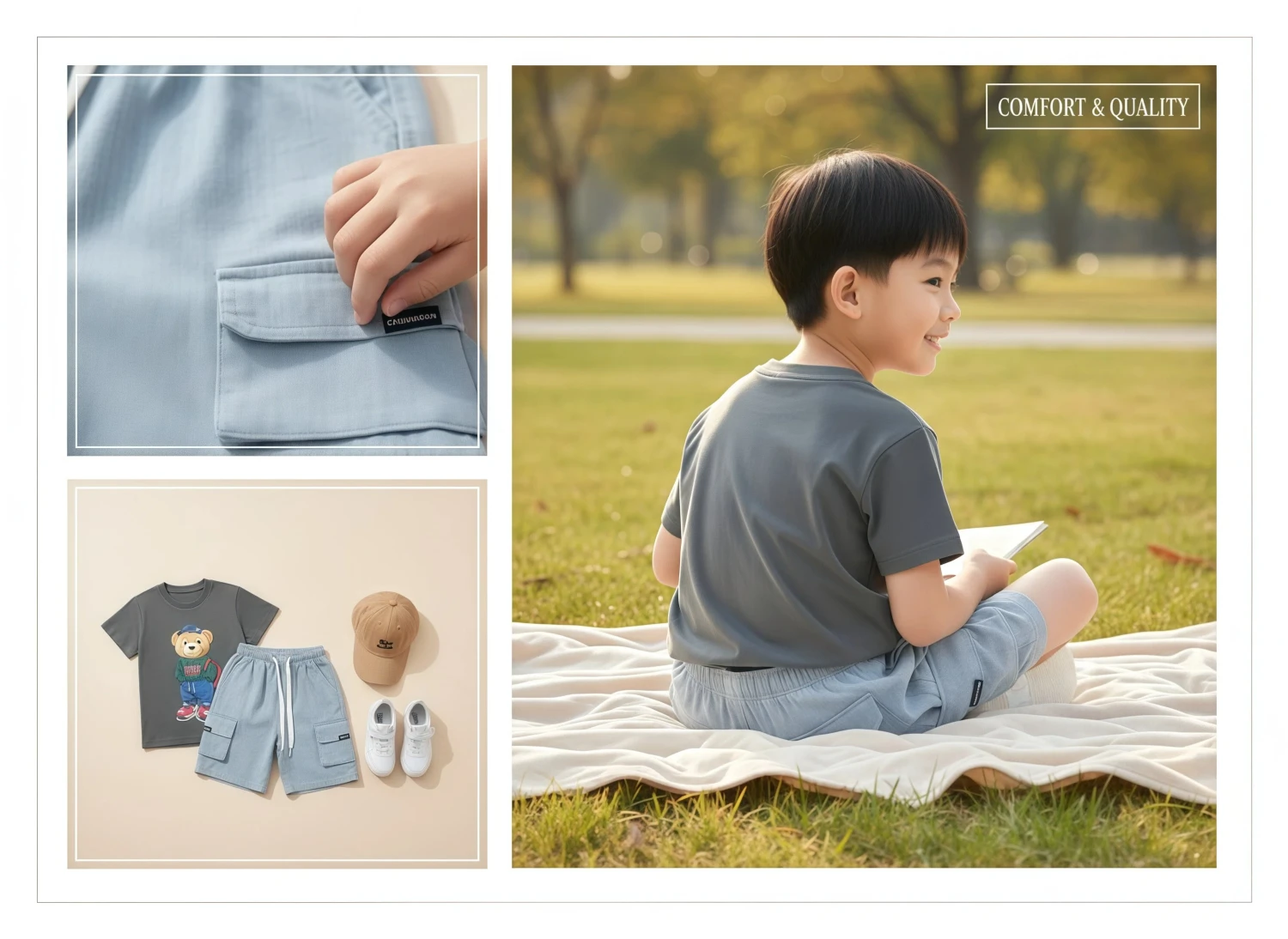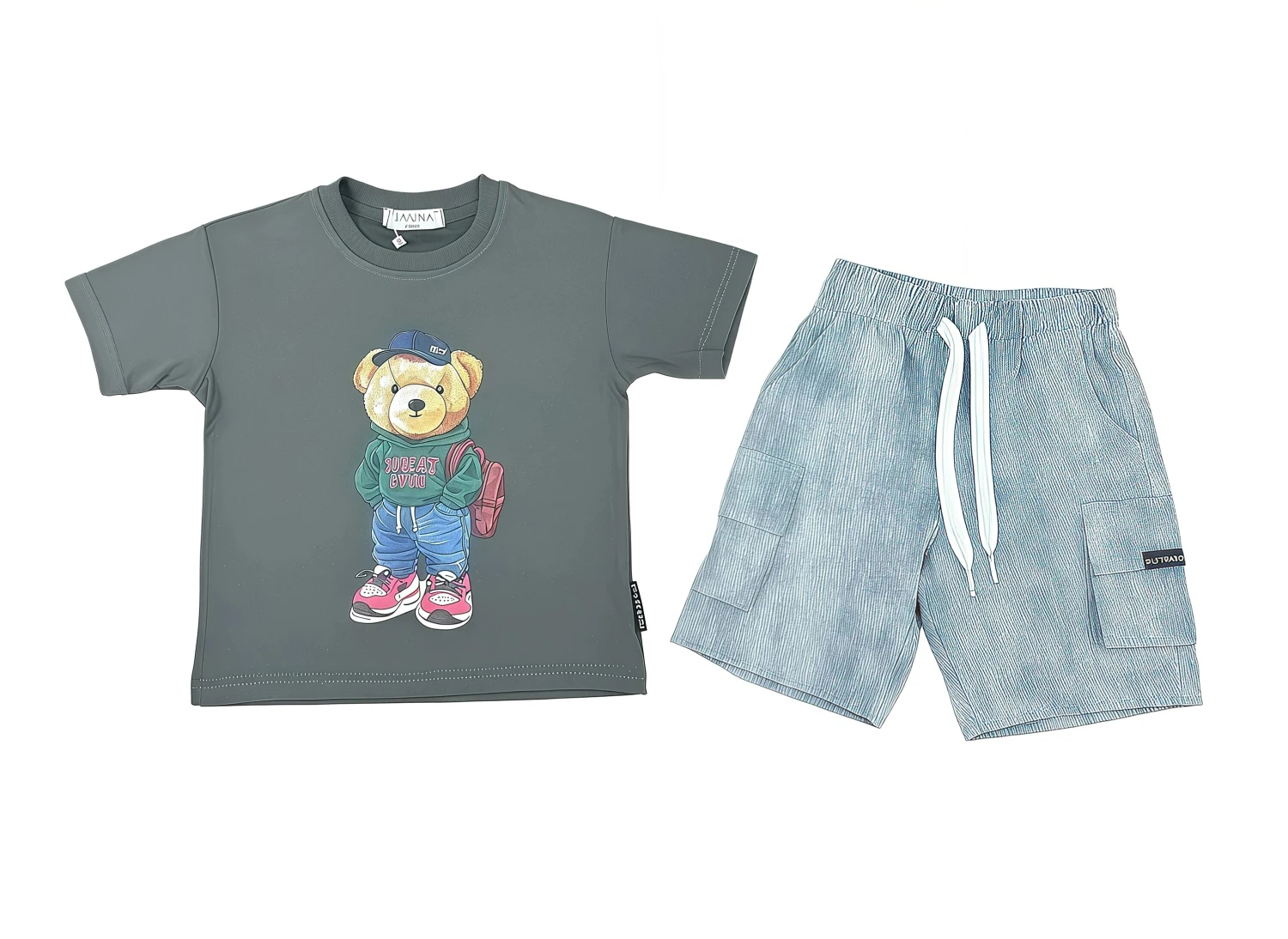 The set features a soft, breathable grey t-shirt showcasing a cool bear character dressed in a cap, hoodie, and sneakers, ready for action! Paired with stylish light blue cargo shorts, complete with functional side pockets and an adjustable drawstring waist, this ensemble offers both practicality and a trendy look. Made from comfortable, durable fabrics, this set ensures your child stays cool and comfy all day long while looking effortlessly stylish.