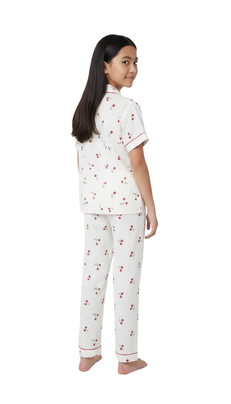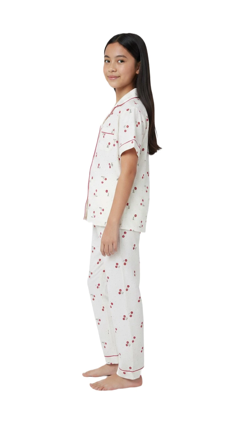 Drift into sweet dreams with our "Cherry Delight" Girls' Pajama Set! This adorable two-piece pajama set features a whimsical cherry print on a soft, breathable fabric, ensuring comfort all night long. The short-sleeve top boasts a classic button-down design with charming red piping details, mirrored on the matching full-length pajama pants. Designed for a relaxed fit, these pajamas are perfect for cozy evenings, sleepovers, and lazy weekend mornings.