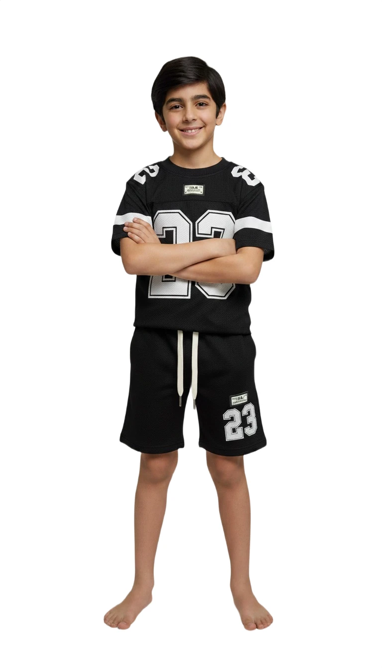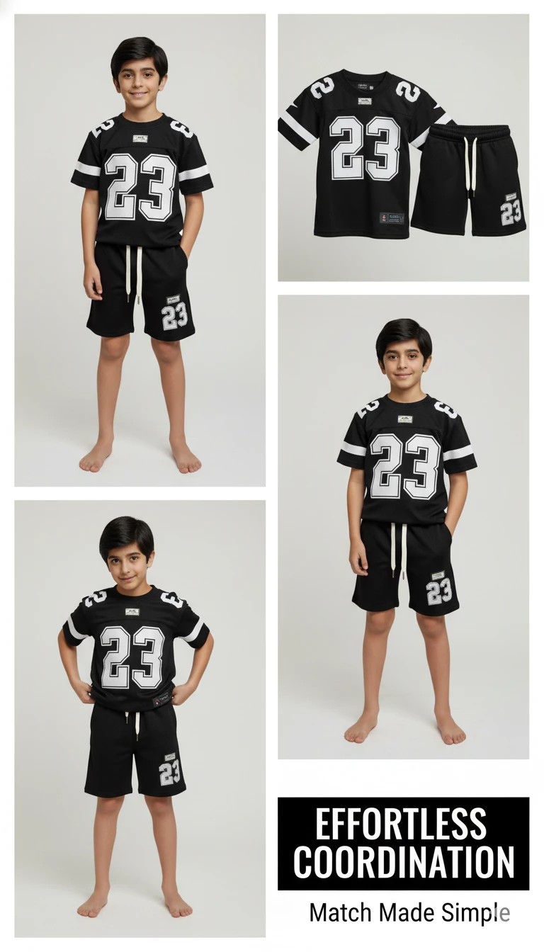 The top features bold "23" numbering on the front, along with sporty stripe detailing on the sleeves, giving it an authentic athletic vibe. The coordinating shorts come with a comfortable drawstring waist for a perfect fit and convenient side pockets to keep his essentials close. Durable and easy to care for, this set is ready for all his adventures. Let him express his inner athlete and look great doing it!