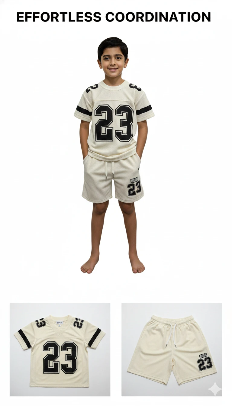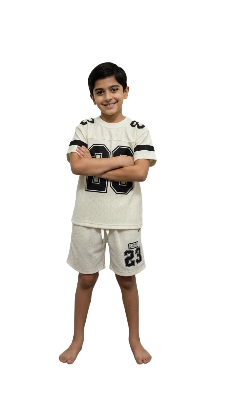 The top features bold "23" numbering on the front, along with sporty stripe detailing on the sleeves, giving it an authentic athletic vibe. The coordinating shorts come with a comfortable drawstring waist for a perfect fit and convenient side pockets to keep his essentials close. Durable and easy to care for, this set is ready for all his adventures. Let him express his inner athlete and look great doing it!