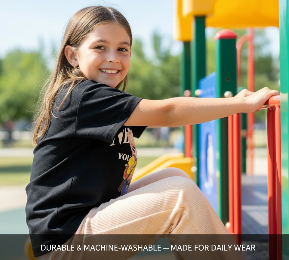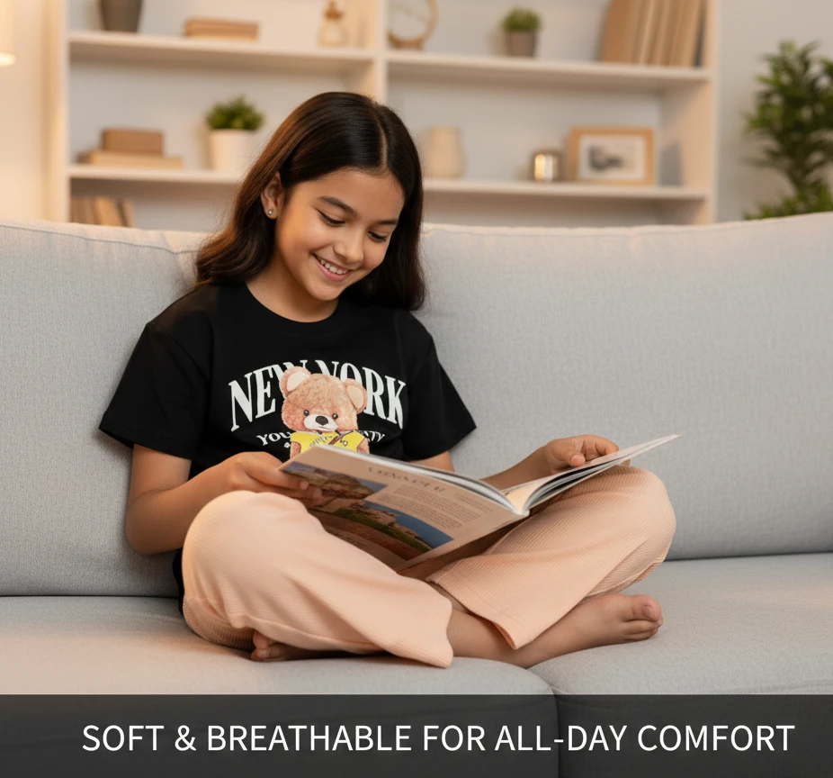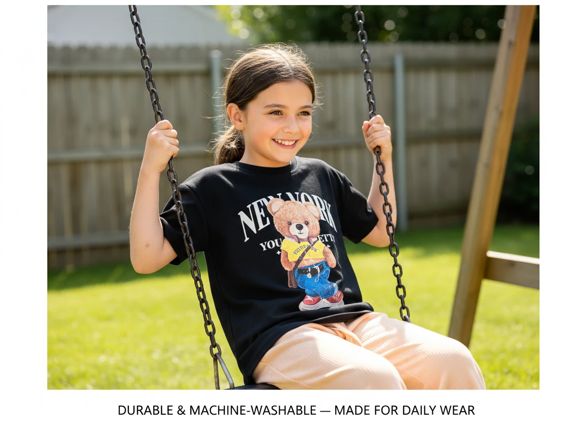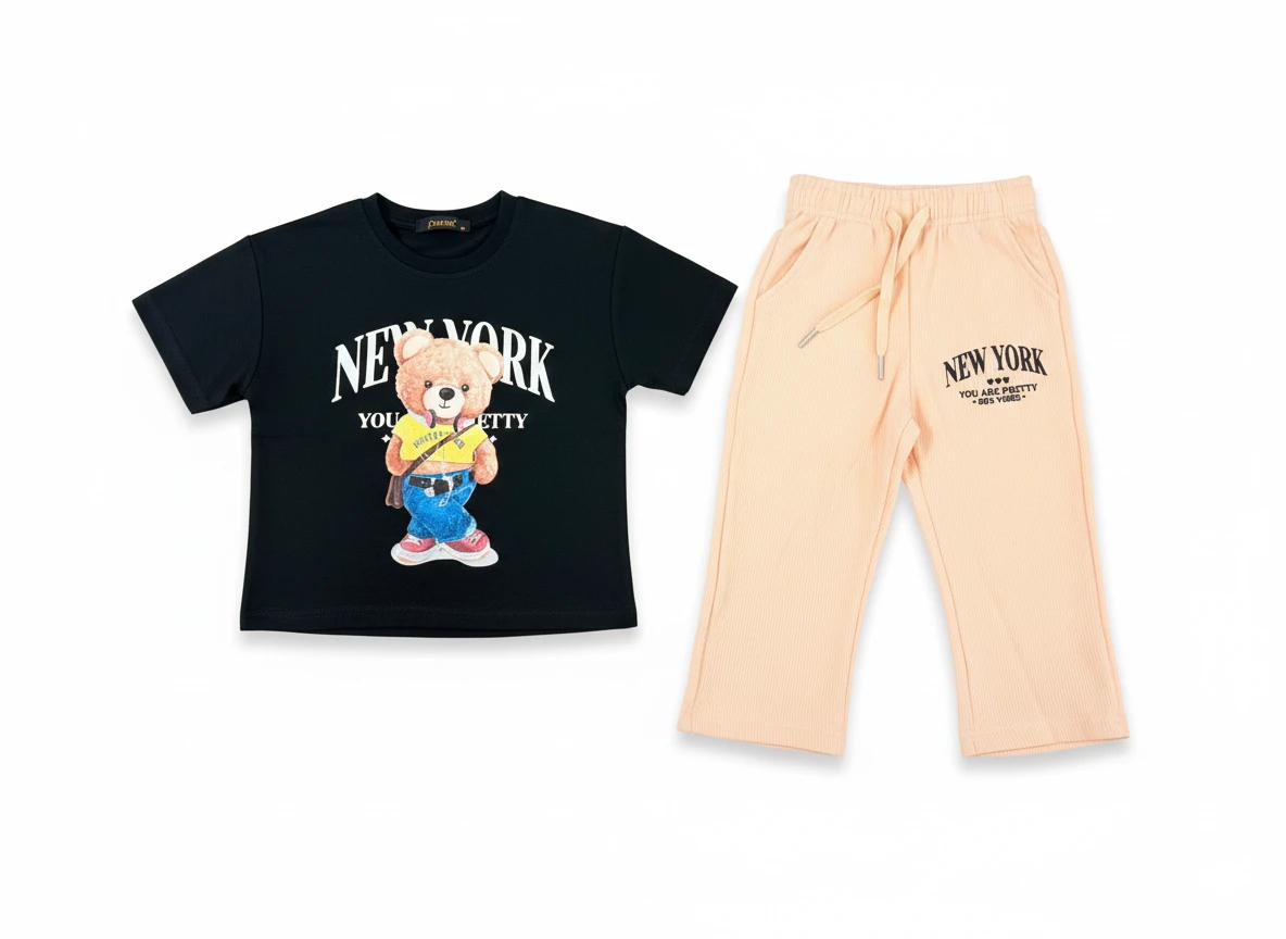 Let her express her playful side with this adorable and comfortable casual set! Featuring a charming black t-shirt adorned with a cute, denim-clad bear graphic and bold "New York" lettering, this outfit is designed for both style and ease. The soft, breathable fabric ensures all-day comfort, whether she's out and about or relaxing at home.