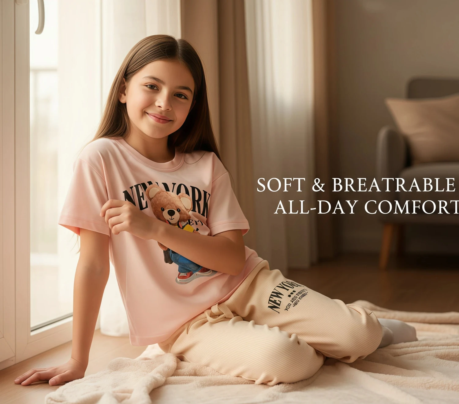 The coordinating peach-colored jogger pants proudly display "New York" text, adding a trendy touch to the ensemble. With a relaxed fit and an elastic waistband, these joggers provide ultimate freedom of movement. This versatile set is an essential addition to any girl's wardrobe, perfect for everyday wear, sleepovers, or simply lounging in style.