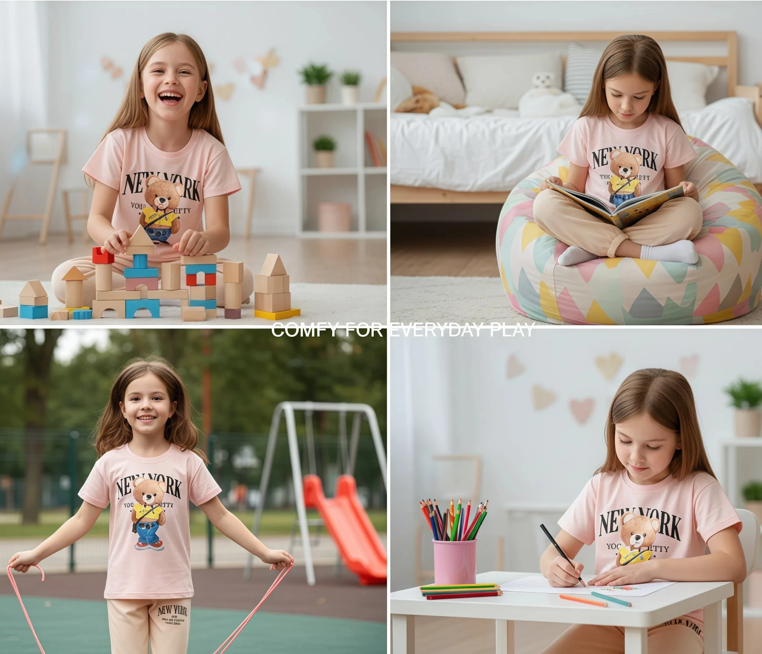 Let her express her playful side with this adorable and comfortable casual set! Featuring a charming black t-shirt adorned with a cute, denim-clad bear graphic and bold "New York" lettering, this outfit is designed for both style and ease. The soft, breathable fabric ensures all-day comfort, whether she's out and about or relaxing at home.