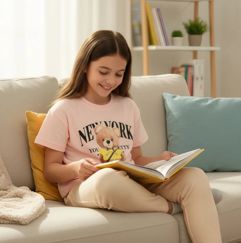 • Cute Bear Graphic: Playful teddy bear design on the t-shirt.