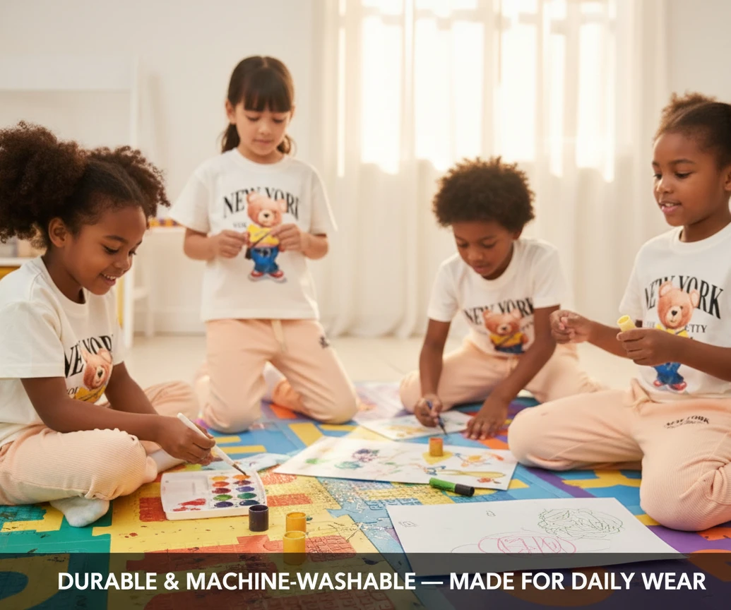 • Cute Bear Graphic: Playful teddy bear design on the t-shirt.