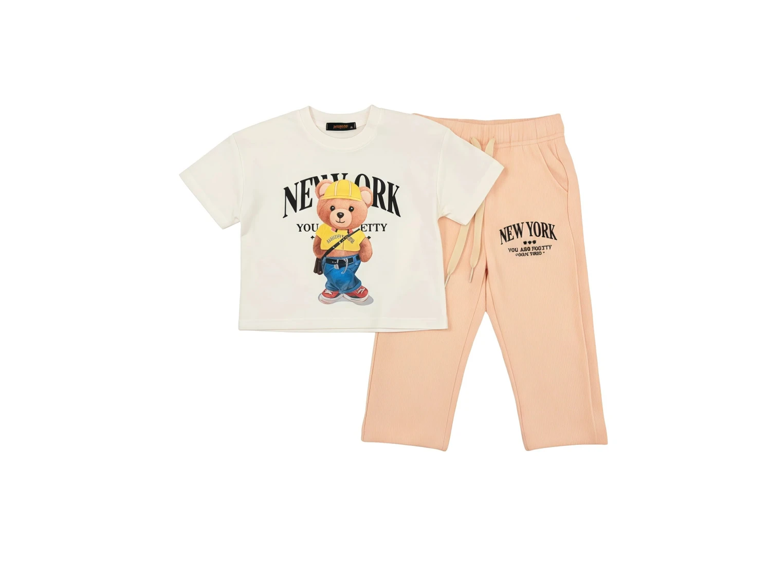 The coordinating peach-colored jogger pants proudly display "New York" text, adding a trendy touch to the ensemble. With a relaxed fit and an elastic waistband, these joggers provide ultimate freedom of movement. This versatile set is an essential addition to any girl's wardrobe, perfect for everyday wear, sleepovers, or simply lounging in style.