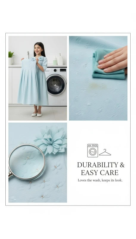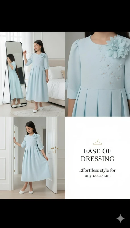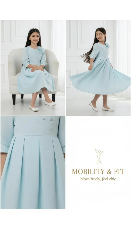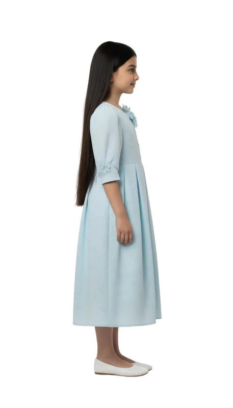 This charming dress features a delicate mint green hue, beautifully complemented by intricate floral embroidery on the bodice. Three-dimensional floral appliques adorn the chest and sleeves, adding a whimsical touch and elegant texture. The classic A-line silhouette with graceful pleats ensures comfort and freedom of movement, making it perfect for special occasions, parties, or stylish everyday wear. Crafted from a soft, high-quality fabric, this dress is designed to make her feel as lovely as she looks."