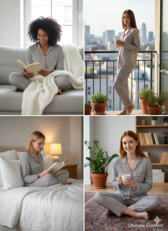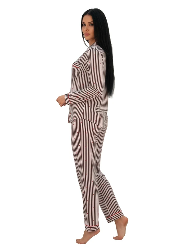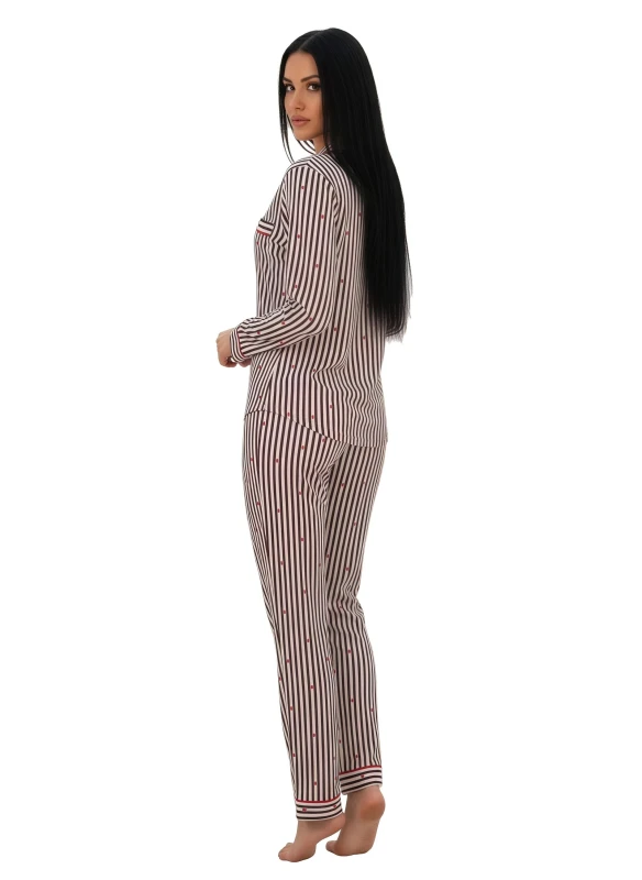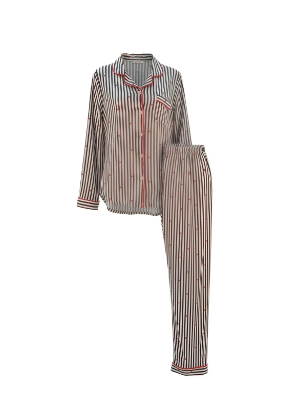 Embrace delightful dreams and cozy mornings with this charming women's pajama set. This two-piece sleepwear ensemble features a long-sleeved button-up top and matching full-length pants, both adorned with a sweet pink and white striped pattern punctuated by small red heart accents. The soft, breathable fabric ensures comfort throughout the night, while the classic design with contrasting red piping adds a touch of playful sophistication. Perfect for lounging or sleeping, this set combines comfort with an irresistibly cute aesthetic.