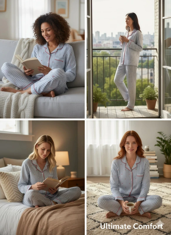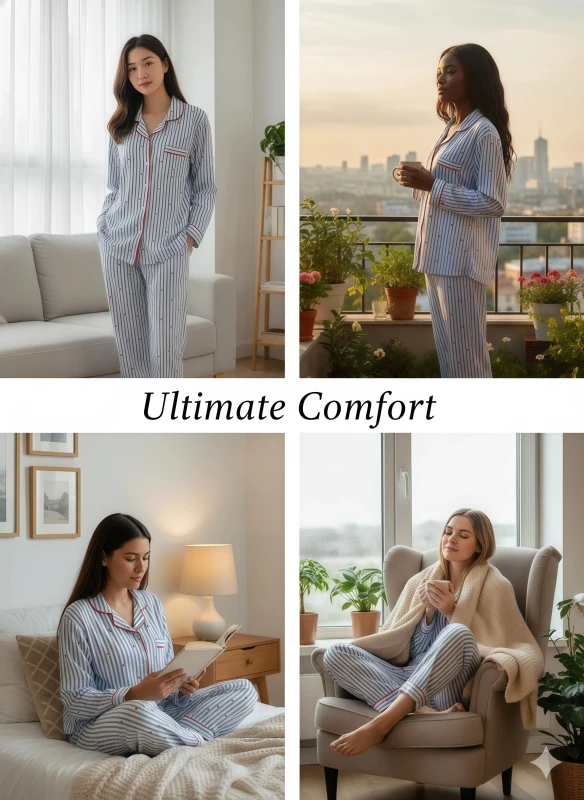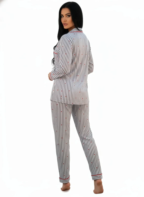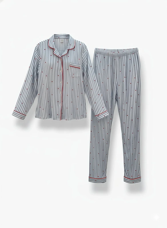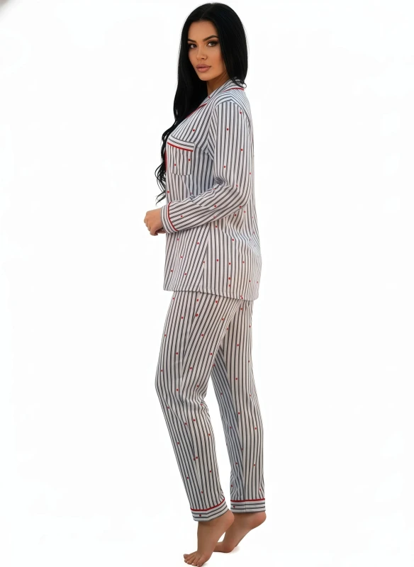 Embrace delightful dreams and cozy mornings with this charming women's pajama set. This two-piece sleepwear ensemble features a long-sleeved button-up top and matching full-length pants, both adorned with a sweet pink and white striped pattern punctuated by small red heart accents. The soft, breathable fabric ensures comfort throughout the night, while the classic design with contrasting red piping adds a touch of playful sophistication. Perfect for lounging or sleeping, this set combines comfort with an irresistibly cute aesthetic.