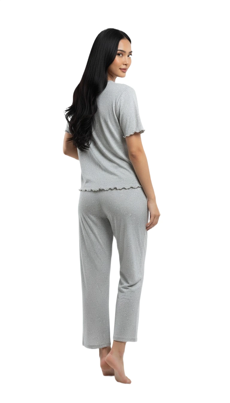 F246670BT Floral Print Button-Front Pajama Set - Gray