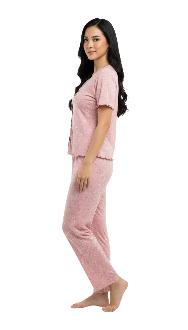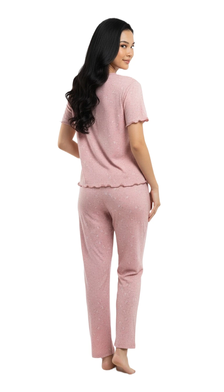 Drift into comfort with our elegant Floral Print Pajama Set, designed for serene nights and relaxed mornings. This beautiful two-piece sleepwear features a V-neck, short-sleeve top in a soft  hue, adorned with a delicate all-over floral pattern. The top is accentuated with charming small white bows down the front, adding a touch of feminine grace. The matching full-length pants complement the top with the same subtle floral print and a comfortable elastic waistband, ensuring a relaxed and flattering fit. Crafted from a soft, breathable fabric, this pajama set provides ultimate comfort, making it perfect for a peaceful night's sleep or stylish lounging around the house.