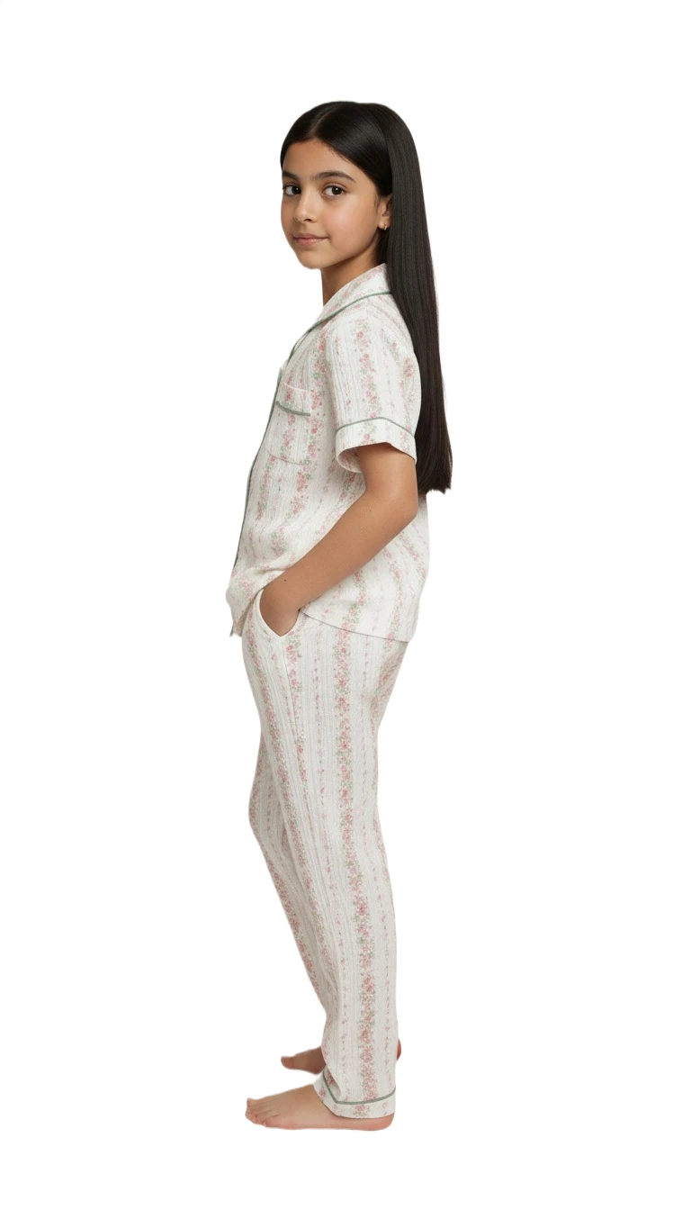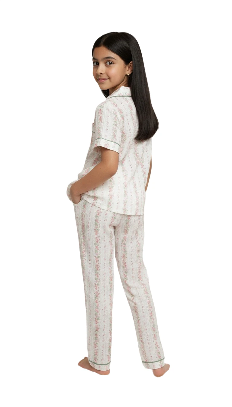 Drift off to sleep in elegant comfort with this charming two-piece pajama set for girls. Adorned with a delicate vintage-inspired floral stripe pattern in soft pinks and greens on a pristine white background, these pajamas offer a timeless appeal. The short-sleeved top features a classic notched collar, a convenient chest pocket, and a full button-down front, all accented with a complementary green piping for a polished finish. The matching full-length bottoms provide a relaxed fit, ensuring ultimate comfort for a restful night's sleep or cozy lounging. Made from a gentle, breathable fabric, this set combines traditional style with modern comfort.