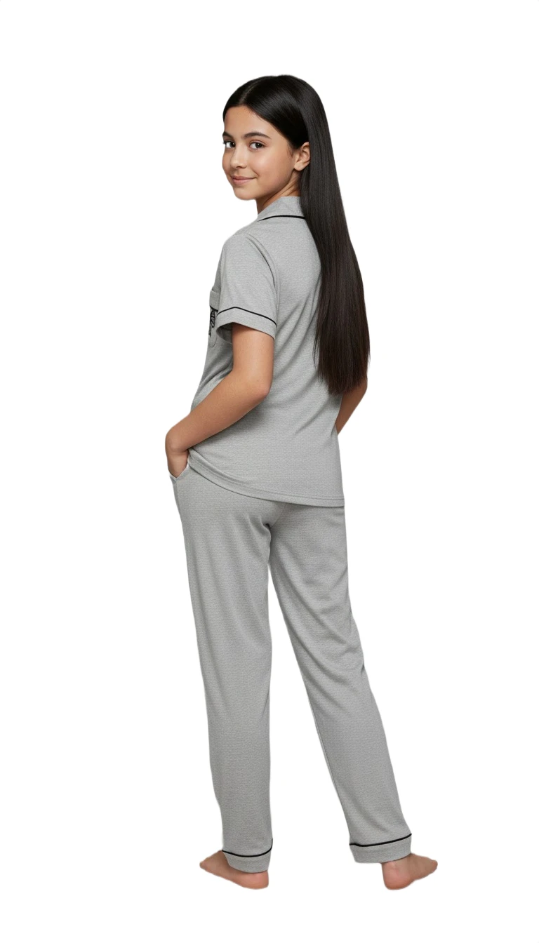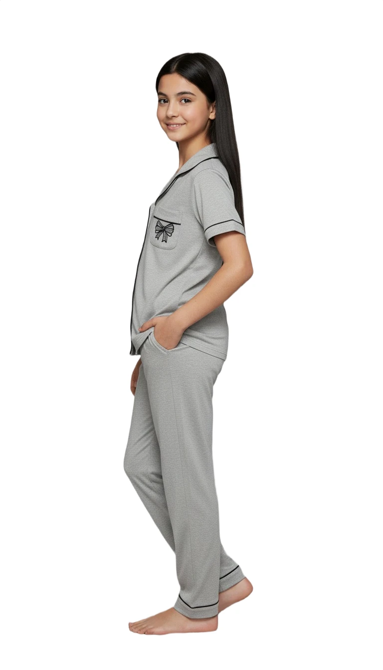 **Product Description:** Drift off to dreamland in style and comfort with our charming Pajama Set! This delightful two-piece sleepwear ensemble is perfect for lounging and sleeping. The short-sleeve top features a classic button-down design with elegant black piping accents and a sweet black bow detail on the chest pocket, adding a touch of playful sophistication. The matching full-length pants ensure ultimate comfort with a relaxed fit. Made from a soft and breathable fabric, these pajamas are designed for a peaceful night's sleep or cozy mornings at home. **Key Features:** * Soft and breathable fabric for ultimate comfort * Classic short-sleeve button-down top * Stylish black piping details * Cute black bow accent on chest pocket * Matching full-length pajama pants * Ideal for sleeping, lounging, and relaxation **Keywords:** * Girls pajama set * Kids sleepwear * Youth pajamas * Pajama pants * Pajama top * Short sleeve pajamas * Button-down pajamas * Loungewear * Comfort pajamas * Soft pajamas * Girls clothing * Sleep set * Bow detail pajamas * Children's pajamas
