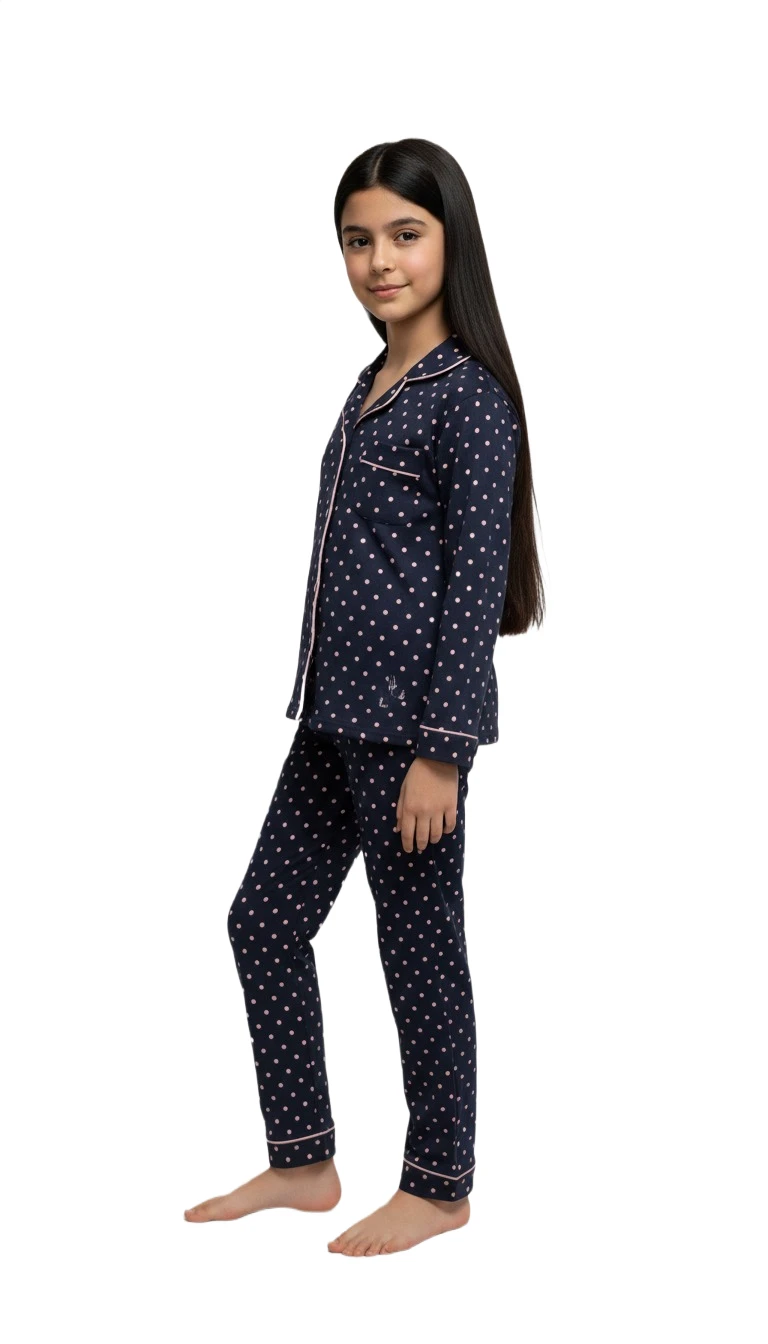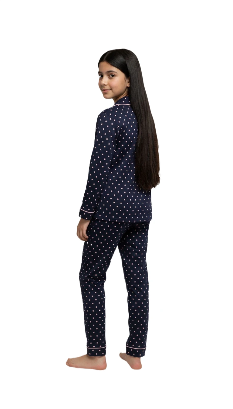 **Product Description:** Make bedtime fun and stylish with our delightful P Polka Dot Pajama Set! This charming two-piece sleepwear ensemble is designed for comfort and cuteness, perfect for sweet dreams and cozy mornings. The long-sleeve top features a classic button-down front with elegant black piping along the collar and cuffs, beautifully complementing the playful black polka dot pattern against the vibrant pink fabric. The matching full-length pajama pants ensure a comfortable fit, allowing for unrestricted movement. Crafted from a soft and breathable material, this set promises warmth without sacrificing comfort, making it an ideal choice for cooler nights or relaxed lounging. **Key Features:** * Soft and comfortable fabric for a peaceful sleep * Vibrant pink base with playful black polka dot print * Classic long-sleeve button-down top * Stylish black piping details on collar and cuffs * Matching full-length pajama pants * Perfect for sleeping, lounging, and cozy relaxation **Keywords:** * Polka dot pajamas * Girls pajama set * Kids sleepwear * Youth pajamas * Pajama pants * Pajama top * Long sleeve pajamas * Button-down pajamas * Loungewear * Comfort pajamas * Soft pajamas * Girls clothing * Sleep set * Black polka dots * Children's pajamas