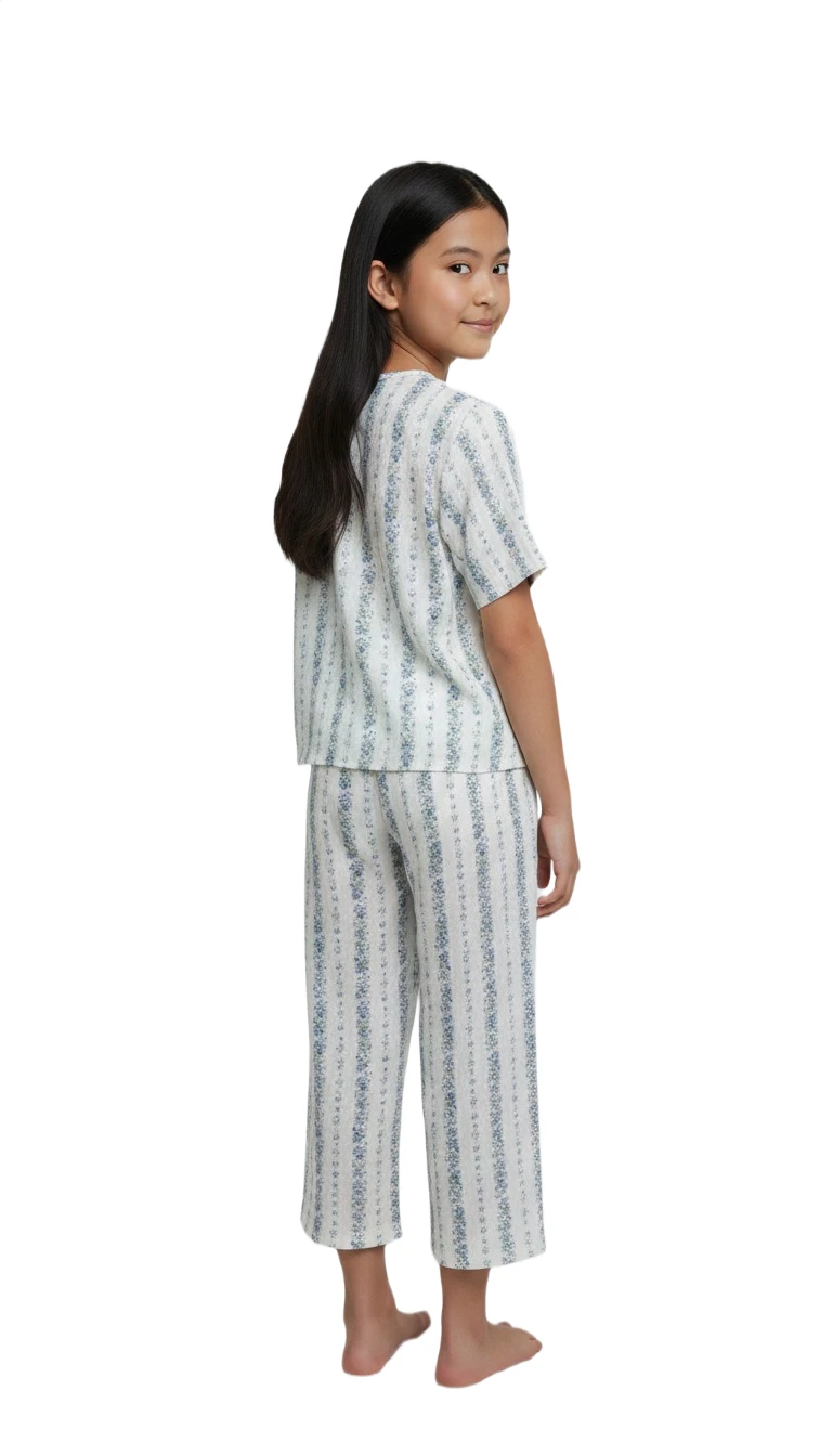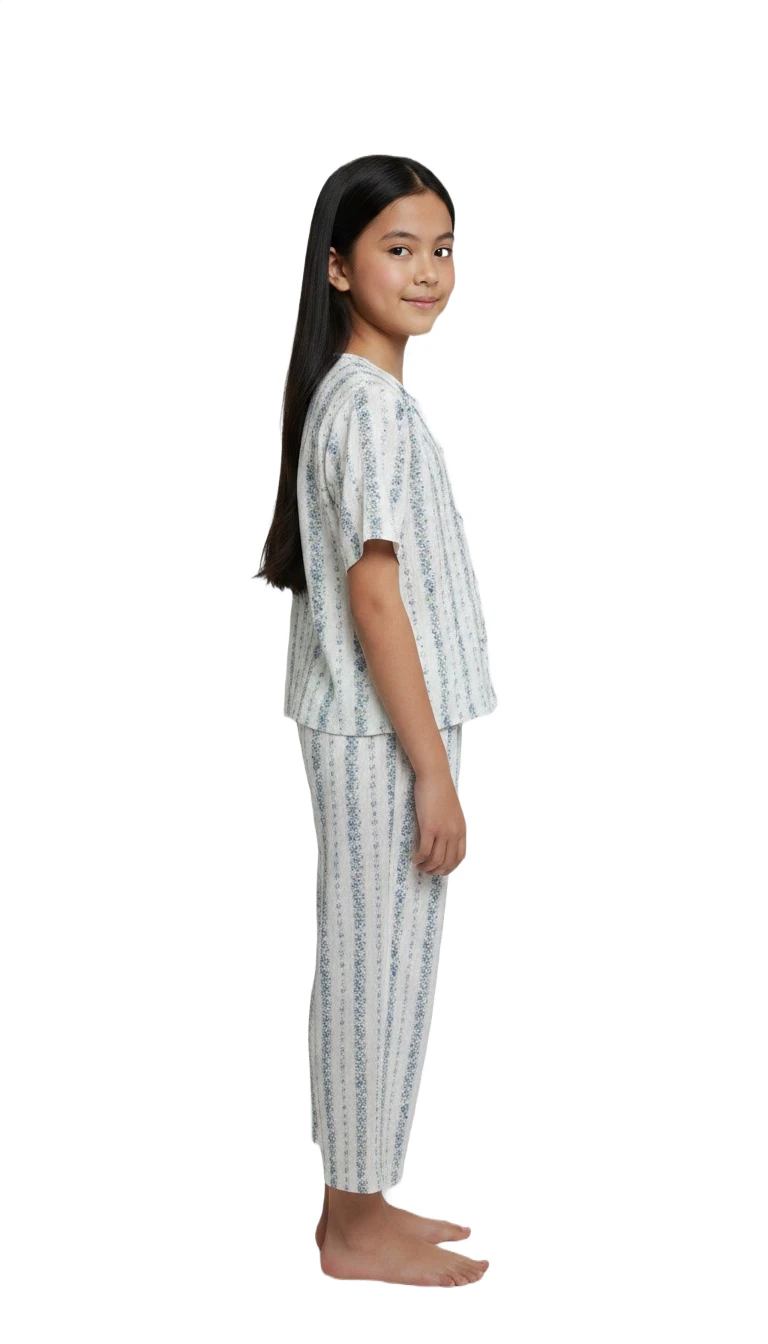 Let her imagination bloom even in her sleep with our enchanting Girls' Azure Bloom Pajama Set! This delightful two-piece sleepwear ensemble is crafted from a soft, gentle, and breathable fabric, perfect for sensitive skin. It features a charming pattern of delicate blue floral or botanical motifs elegantly arranged within vertical stripes, creating a sweet and serene look. The short-sleeved top has a comfortable V-neckline with a cute button placket, making it easy to put on and take off. The matching full-length pants come with a gentle elastic waistband for a comfortable, secure fit, allowing for peaceful sleep and unrestricted play. Ideal for sweet dreams, cozy mornings, or relaxed playtime, this floral striped pajama set combines natural beauty with the comfort every girl deserves.