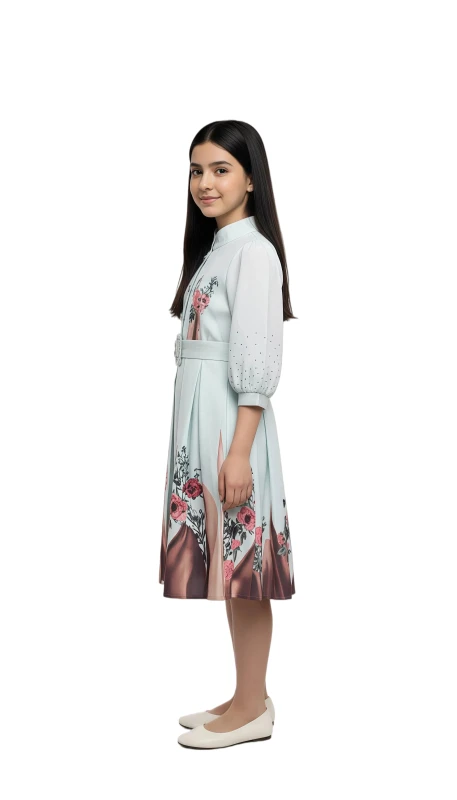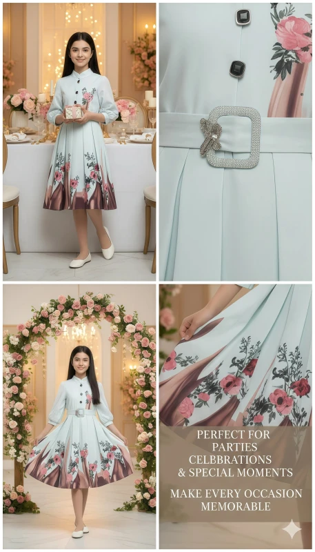 This elegant dress features a striking artistic print that gracefully transitions from vibrant floral motifs on the bodice to a captivating ombre-effect skirt, reminiscent of a serene botanical cascade. The stand-up collar and button-down front create a polished, refined silhouette, while the three-quarter length sleeves with delicate embellishments add a touch of playful sparkle. Cinching the waist is a chic, adjustable belt with an eye-catching butterfly buckle, defining the shape and adding a delightful focal point. The beautifully pleated skirt ensures graceful movement and comfortable wear, making this dress perfect for special occasions, cultural events, holiday celebrations, or simply when she wants to feel exceptionally stylish.