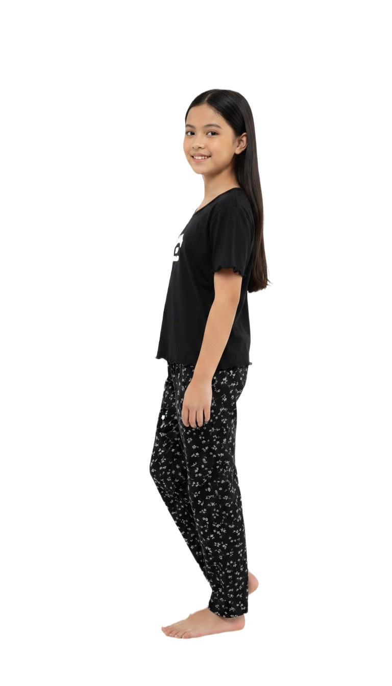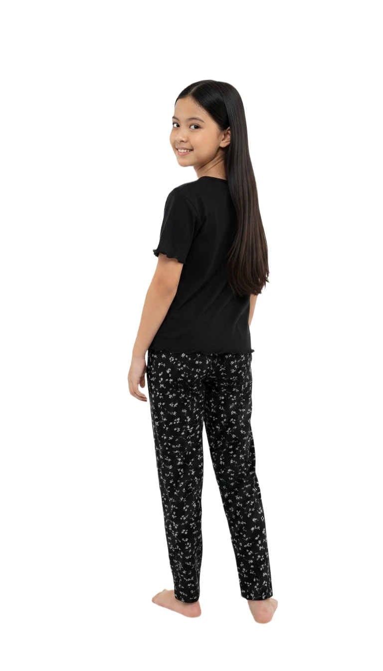 General: Girls pajamas, kids pajama set, children's sleepwear, youth pajamas, nightwear for girls, black pajamas, graphic pajamas, floral print pajamas, comfortable pajamas, two-piece set, home wear for kids.