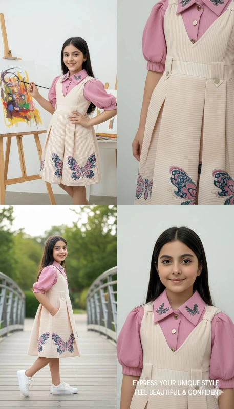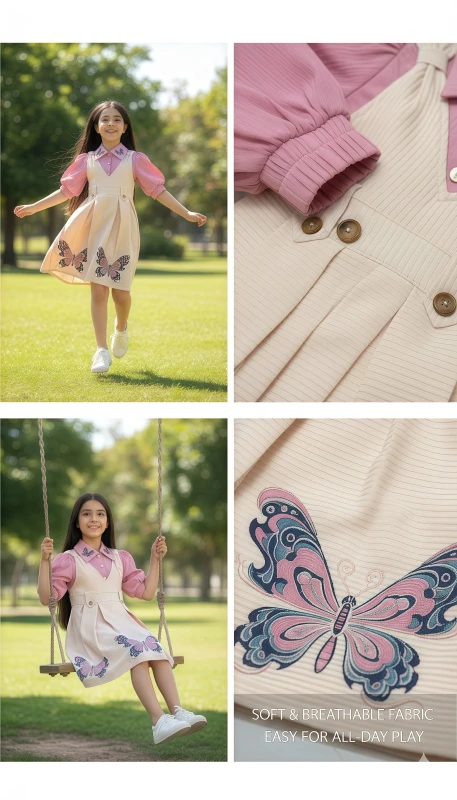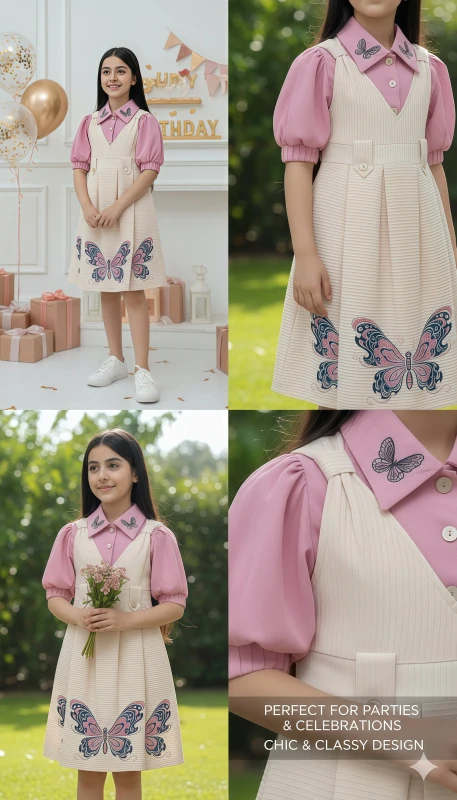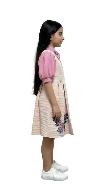 This adorable two-piece set features a charming blush pink collared blouse with delicate butterfly embroidery gracing the collar, adding a touch of whimsical elegance. The matching cream-colored pinafore dress is designed with smart pleats and eye-catching embroidered butterflies in soft hues of pink and blue along the hem. Crafted for comfort and style, this dress is perfect for special occasions, school events, or simply enjoying a day out. Its playful yet sophisticated design makes it a versatile addition to any young girl's wardrobe, ensuring she looks as radiant as she feels.
