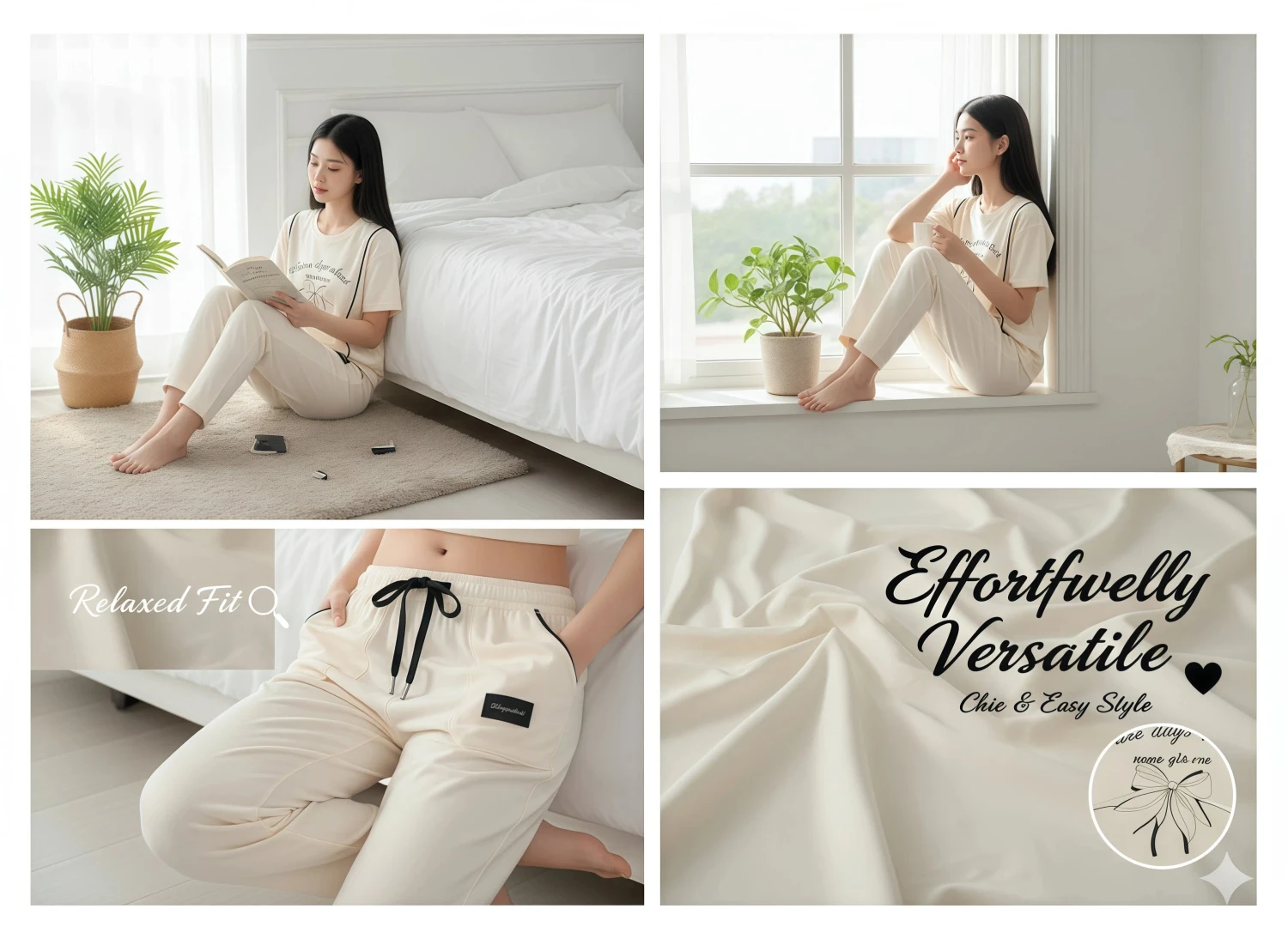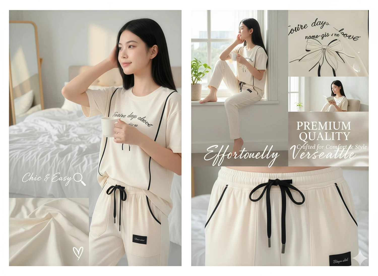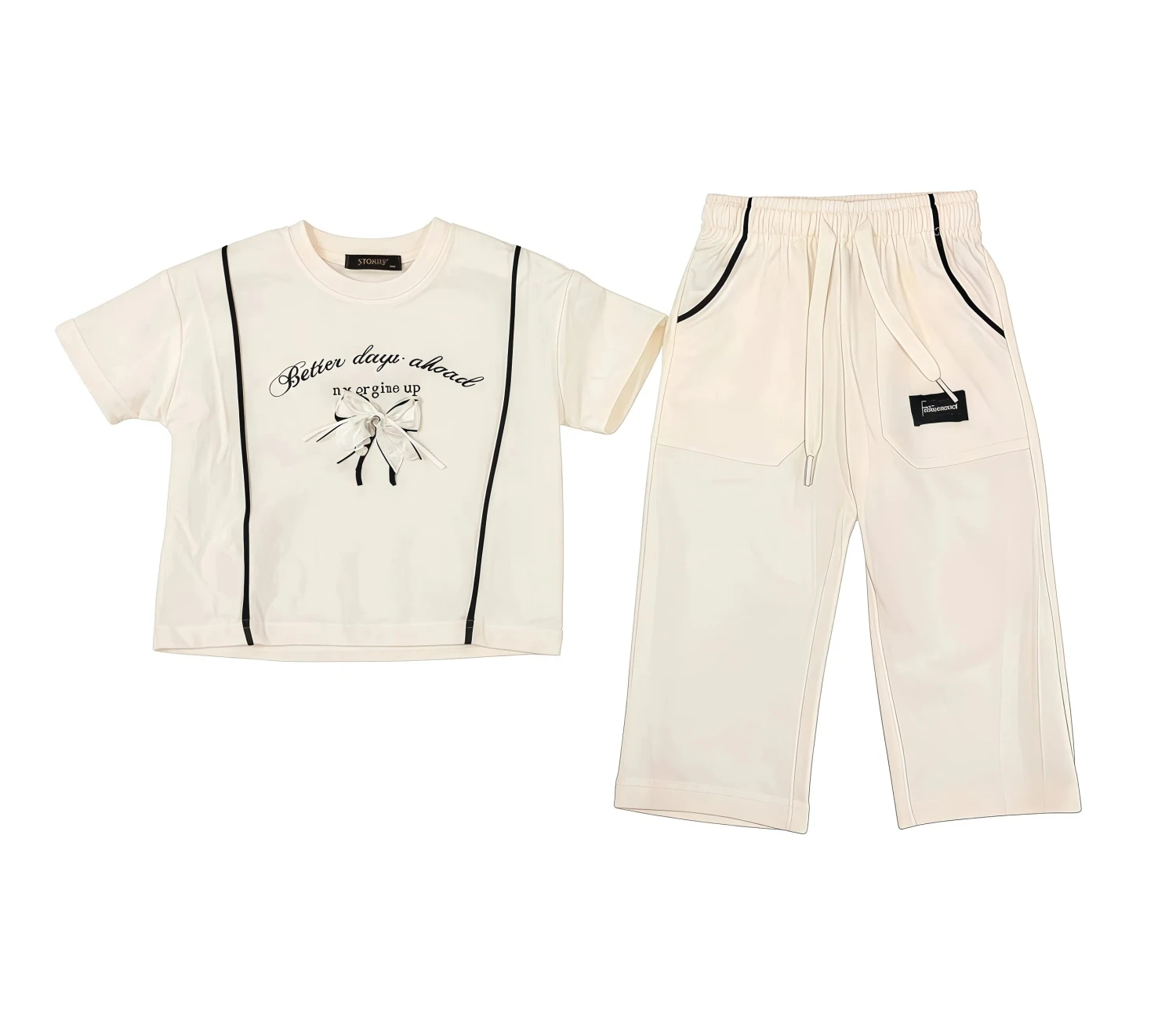 • Style Specific: Bow graphic, cream set, black trim, piping detail, cute loungewear, sweet design, casual chic, printed top, jogger set, fashionable girls, "sweet days ahead".