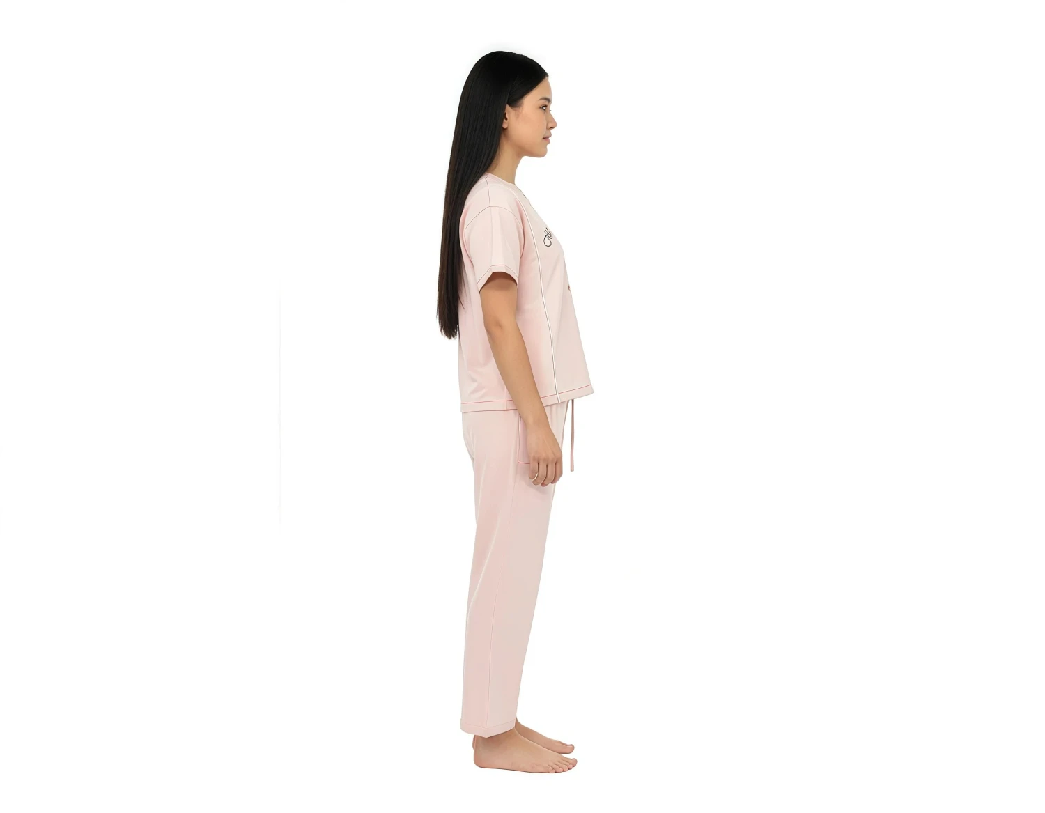 Introduce a touch of cozy elegance to her wardrobe with this charming two-piece loungewear set. Crafted from soft, breathable cream-colored fabric, this set promises ultimate comfort whether she's relaxing at home, enjoying a casual day out, or settling in for a good night's sleep. The short-sleeved top features a delightful black outlined bow graphic, accented with stylish black piping details that continue down the arms. Complementing the top, the matching jogger-style pants come with an adjustable drawstring waist for a perfect fit and feature a black-trimmed pocket for a subtle contrast. With the sweet message "sweet days ahead" delicately written on the top, this set is designed to bring both comfort and a smile.