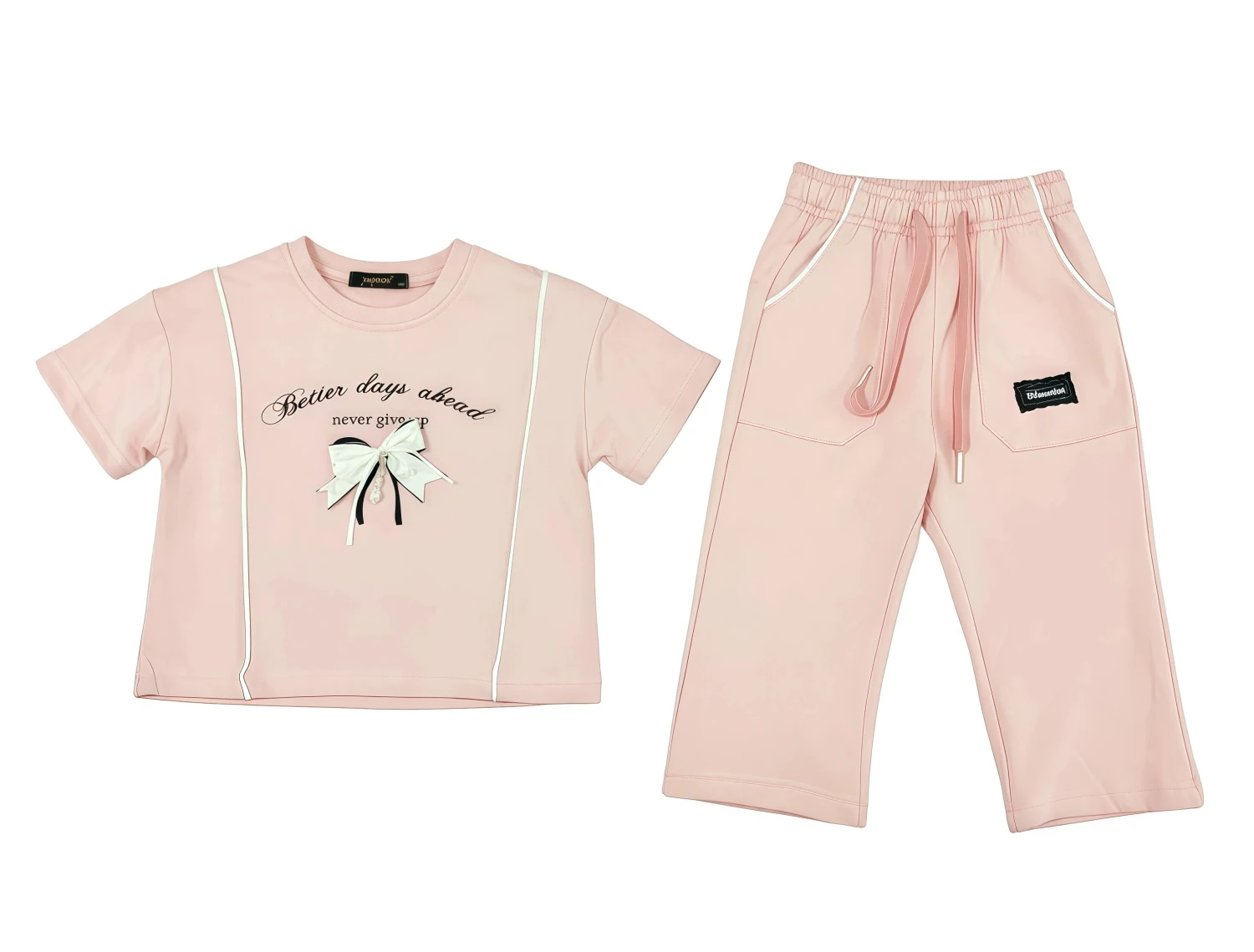 Girls' Casual T-Shirt & Joggers Set with Bow Print - Pink