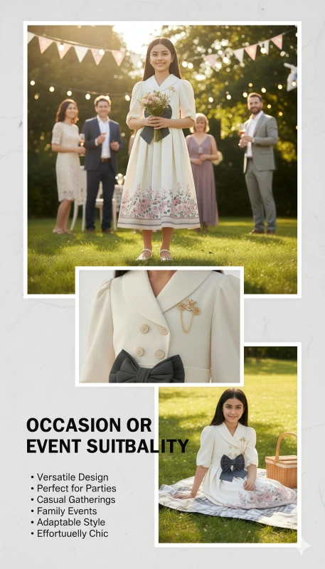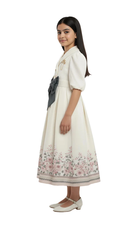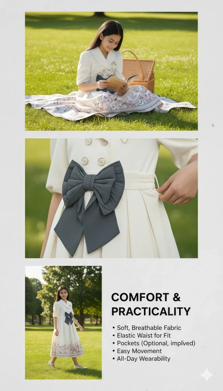 bow at the waist, complemented by elegant pearl-like buttons and a delicate