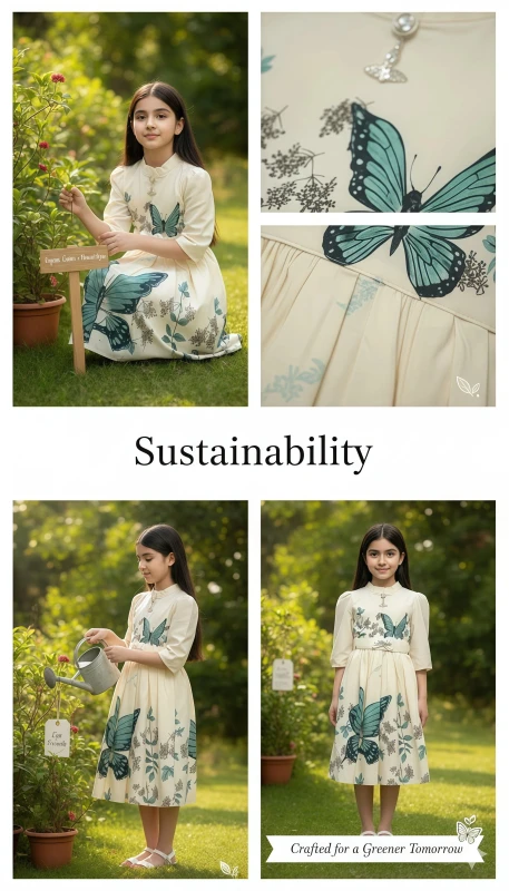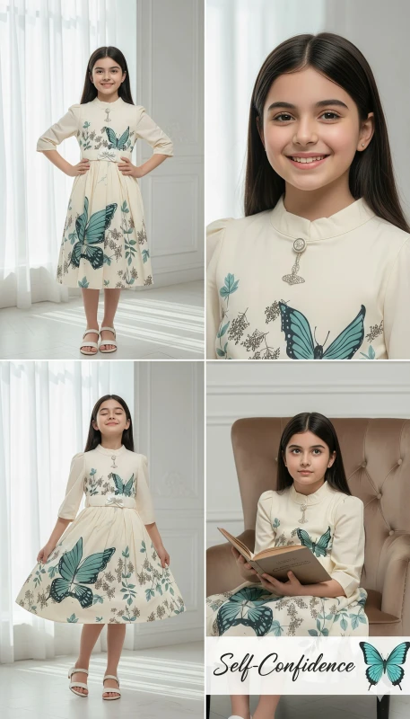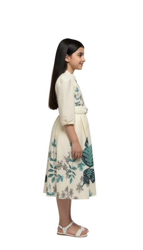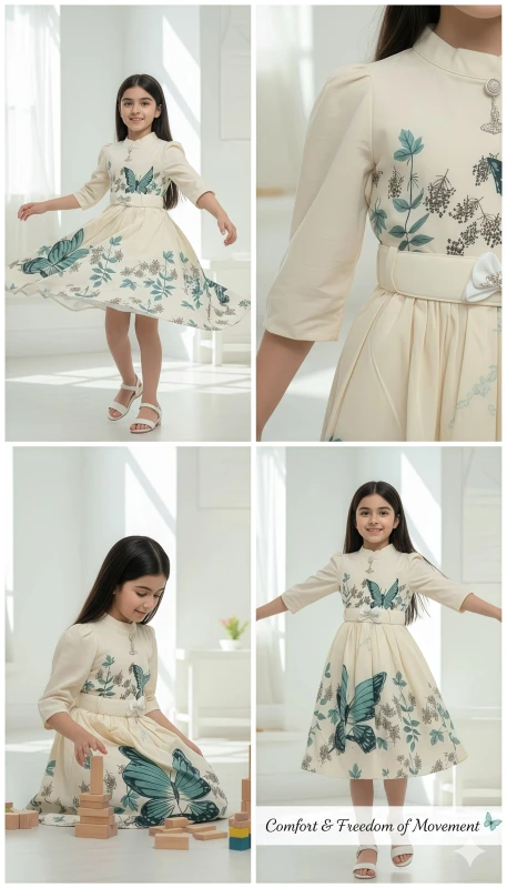 This captivating dress features a soft, delicate pink hue adorned with stunning large teal butterfly prints and intricate botanical details that flutter across the fabric. Designed with a chic stand-up collar and a stylish half-button placket, it offers a sophisticated silhouette. The three-quarter puff sleeves are gently elasticated and embellished with subtle embroidery, adding a touch of whimsical detail. A removable, adjustable white belt with a sparkling butterfly buckle cinches the waist, creating a flattering shape and a charming focal point. The gracefully pleated skirt ensures comfortable movement and twirl-ready fun. Perfect for birthday parties, family gatherings, holiday celebrations, or simply making every day feel a little more magical, this dress is sure to make her feel absolutely radiant.
