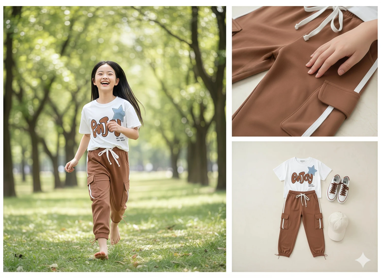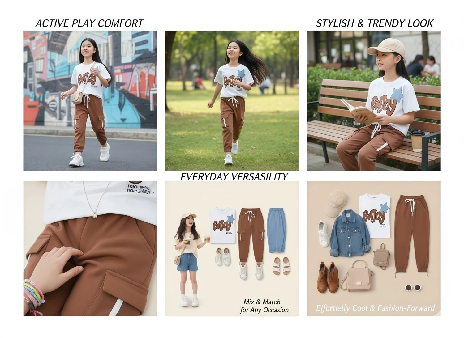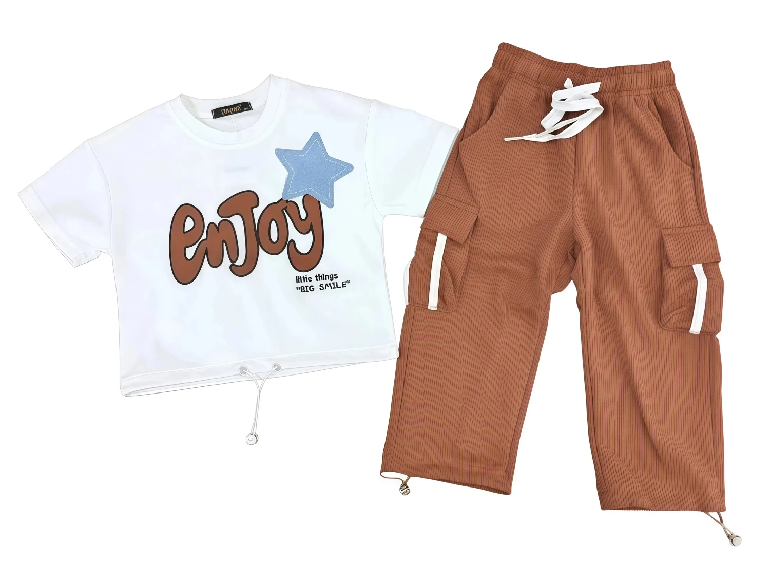 The set features a trendy white cropped t-shirt with a playful "Enjoy" graphic, complete with a cool star accent. Paired with fashionable brown cargo joggers, boasting practical side pockets, stylish white stripe detailing, and an adjustable drawstring waist, this ensemble offers both a relaxed fit and a fashion-forward look. Made from soft, breathable fabric, it ensures she stays comfortable and confident all day long. This versatile set is an essential addition to her casual wardrobe!