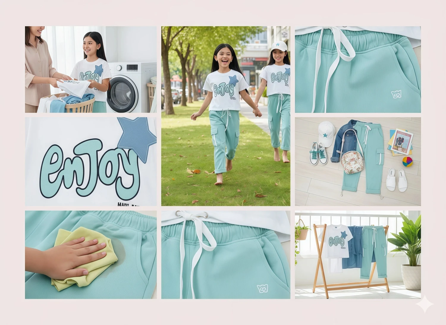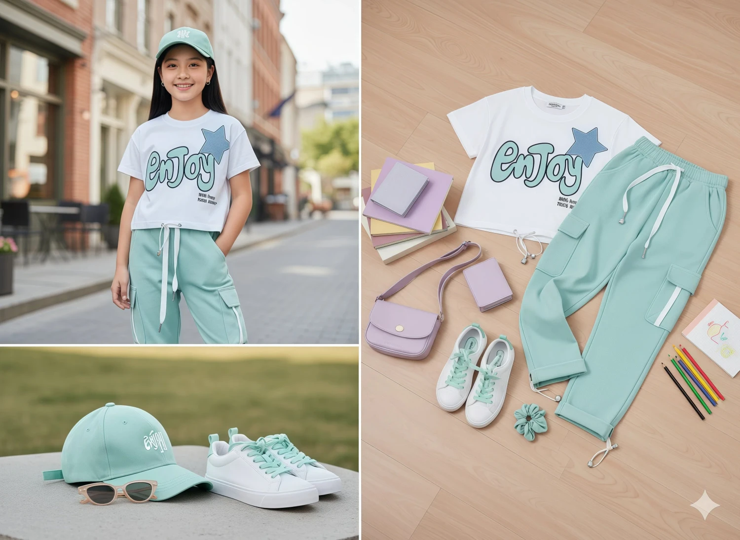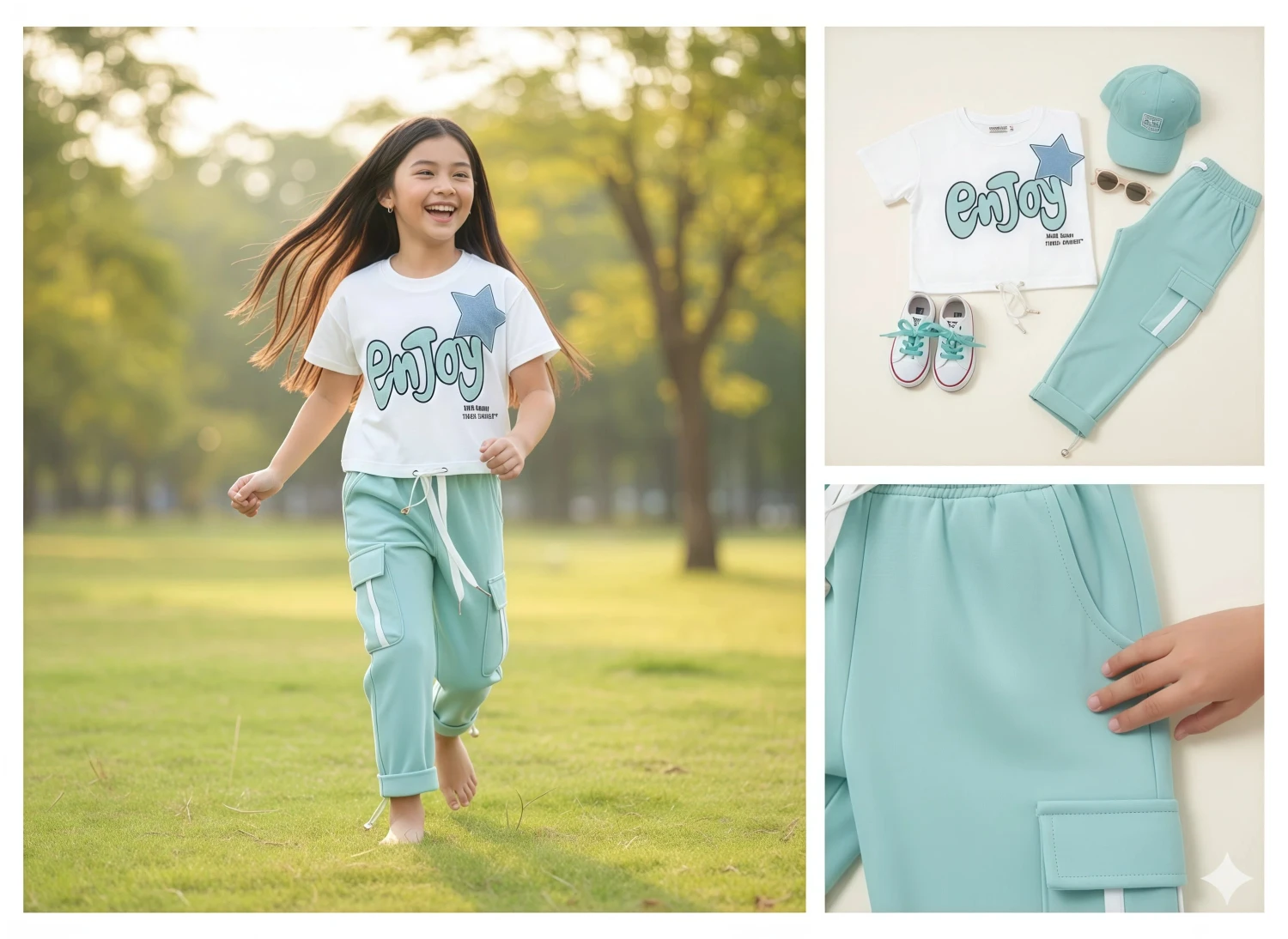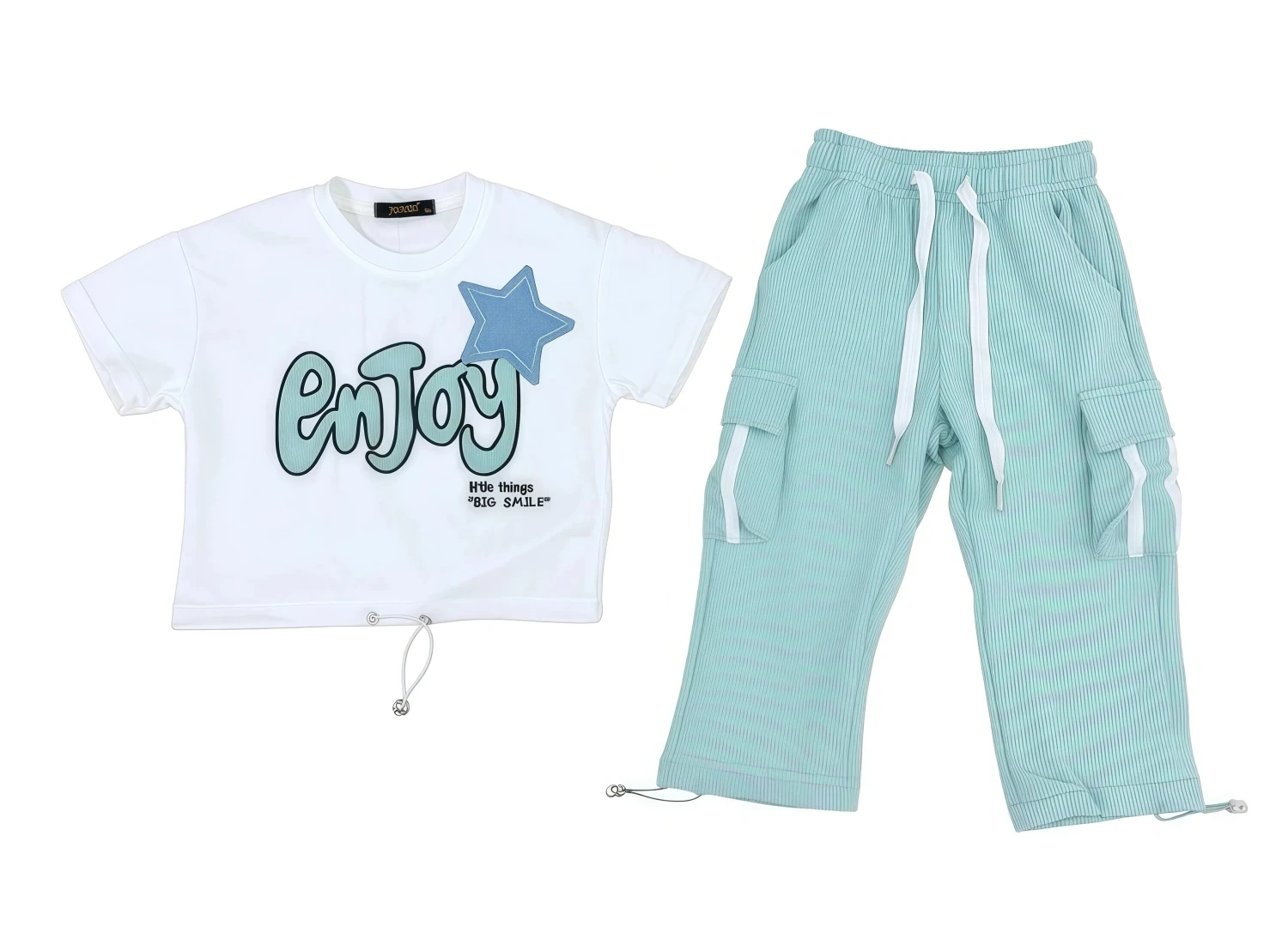set features a trendy white cropped t-shirt with a playful "Enjoy"