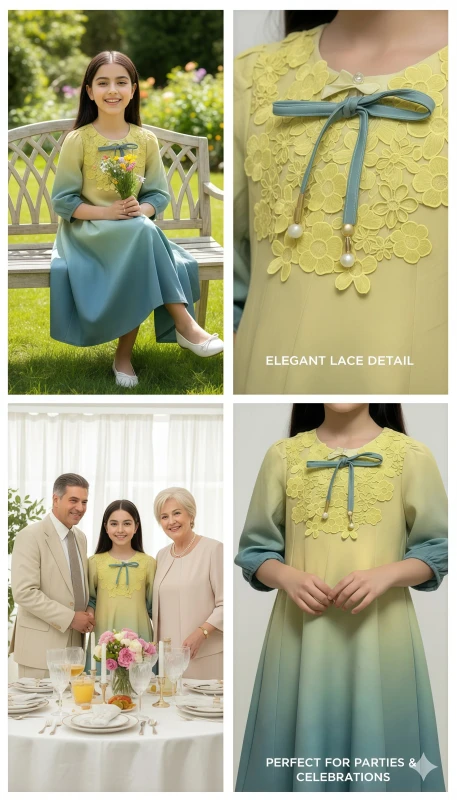 This exquisite dress features a captivating pink-to-blue ombre fade, reminiscent of a magical sunset or twilight sky, with delicate floral patterns blossoming across the skirt. The bodice is adorned with intricate white floral lace, creating a sophisticated and ethereal neckline. A charming bow, accented with elegant pearl drops, adds a touch of playful elegance. With comfortable puff sleeves that gently taper and a twirl-worthy A-line silhouette, this dress is perfect for parties, special events, or any occasion where she wants to shine.