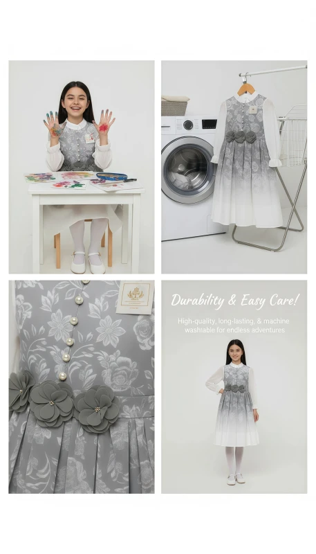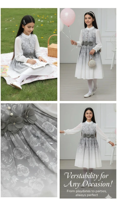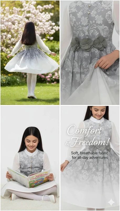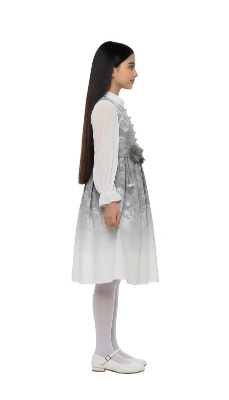 This captivating dress features a beautiful two-tone design, transitioning gracefully from a soft, printed blue-grey hue at the bodice and upper skirt into a crisp, pure white at the hem, creating a stunning ombre effect. The white long sleeves with delicate button cuffs provide a classic and comfortable base, while the bodice is adorned with a subtle floral print that becomes more defined as it fades into the skirt. A charming row of three decorative buttons graces the front, leading to an eye-catching waist sash embellished with a trio of exquisite, handcrafted floral appliqués. Perfect for special occasions, family gatherings, or simply adding a touch of sophisticated charm to her everyday wear, this dress is designed to make her feel like she's walking through an enchanted garden.